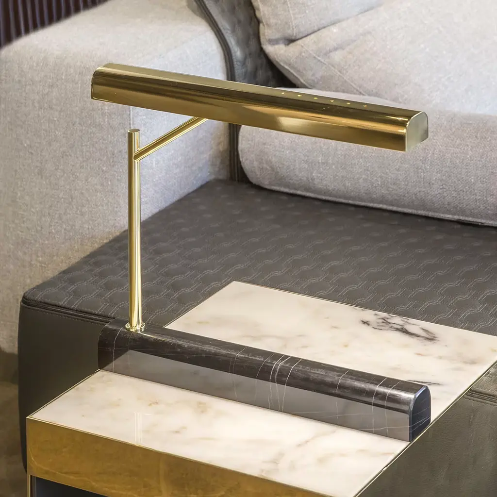Part of the Jade collection of table lamps, this piece combines the opulence of black marble with the stylistic rigor of the glossy brass structure. The warm glow of the metal strikingly contrasts with the dark color of the stone, which will reflect the light coming from above to create a unique ambiance. The two integrated LED light source comes from two 4.8W 3000K bulbs. It is possible to customize this piece, please ask the Concierge for details.