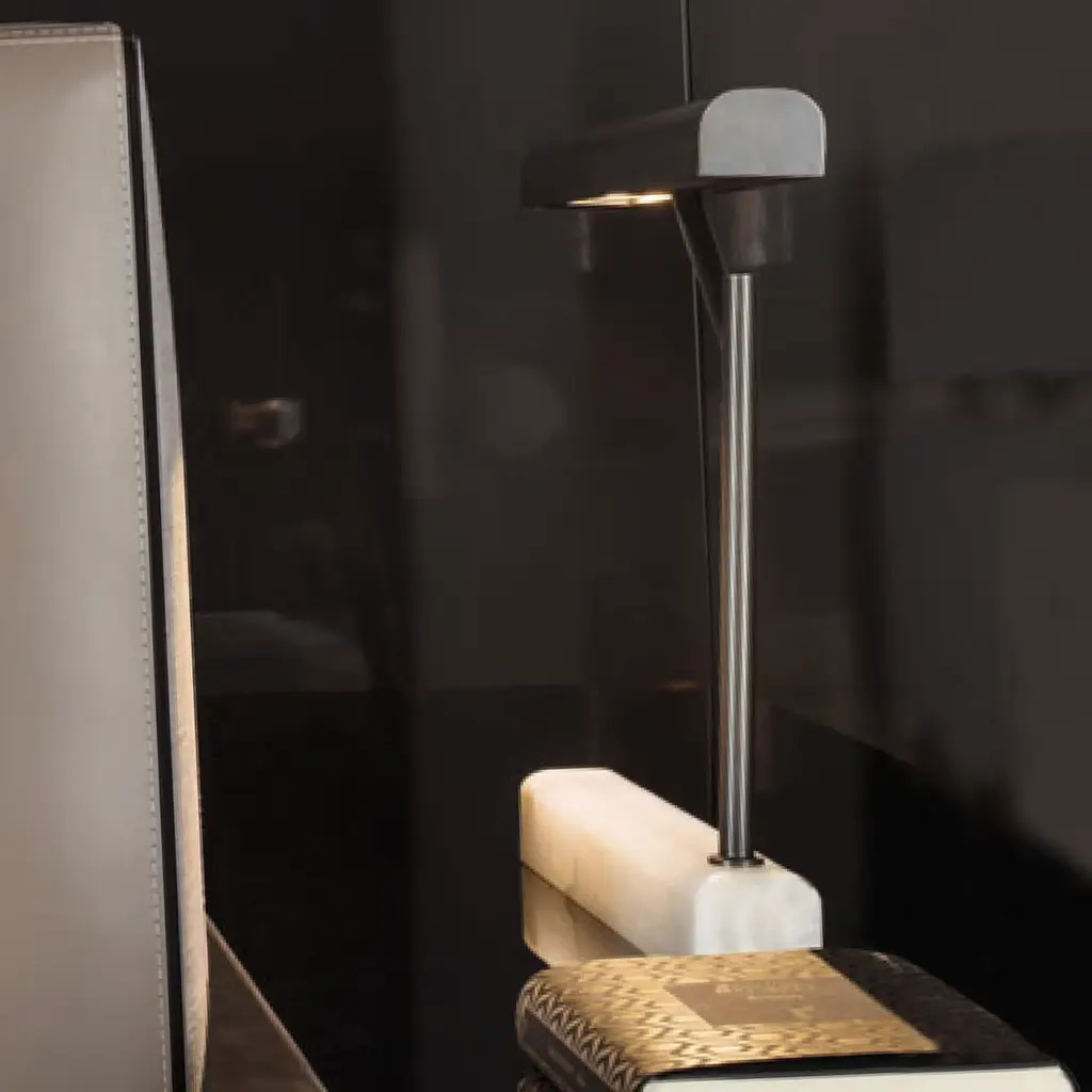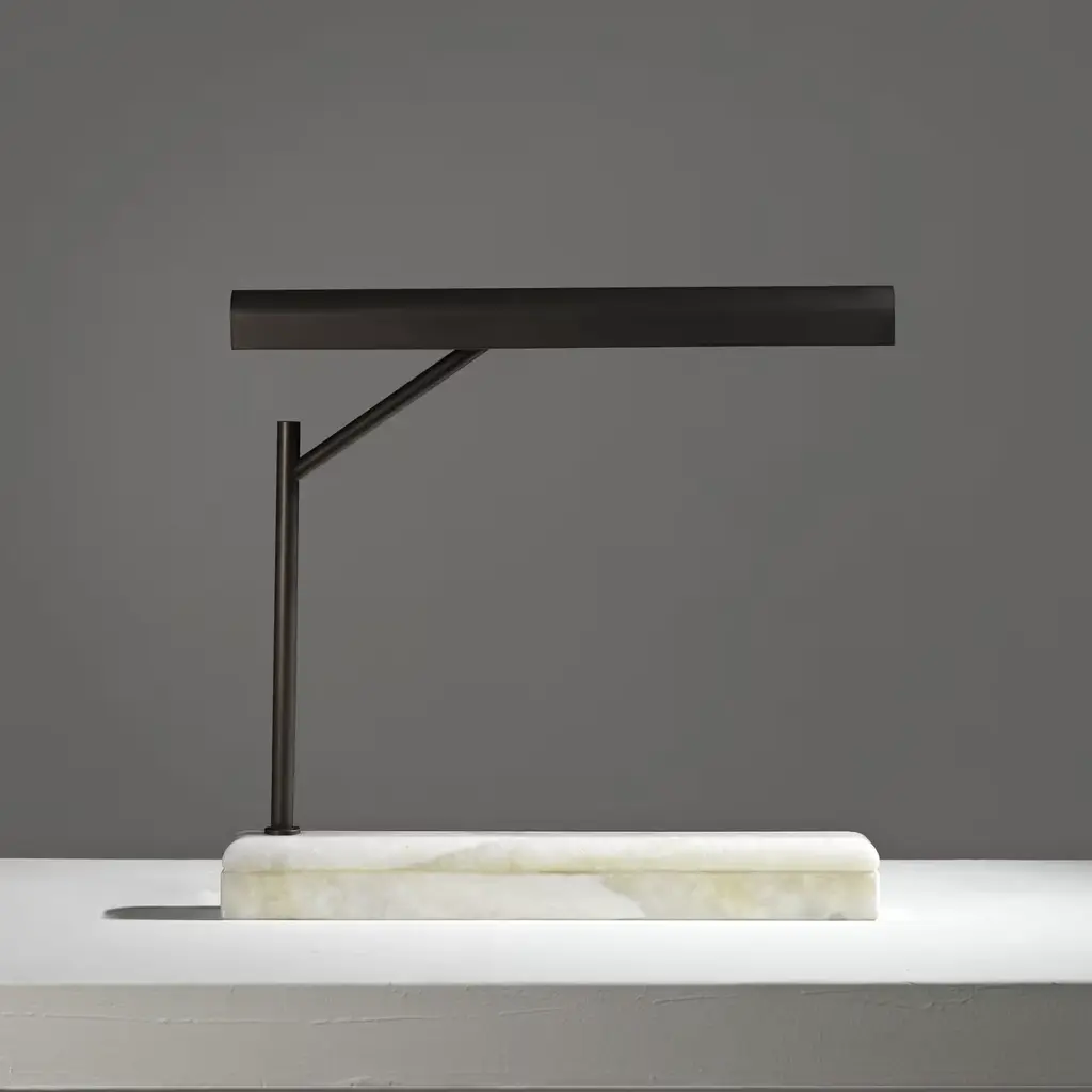 This statement table lamp is a sculptural, decorative piece combined with a functional object. Its minimalist frame in metal with a burnished finish is enriched with a base in onyx that will reflect the light coming from the two 4.8W 3000K LED bulbs with a mesmerizing effect. Part of the Jade collection, this lamp will be an ideal addition to a contemporary or eclectic interior. For customization, please inquire with the Concierge.