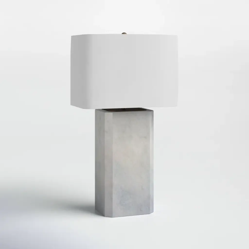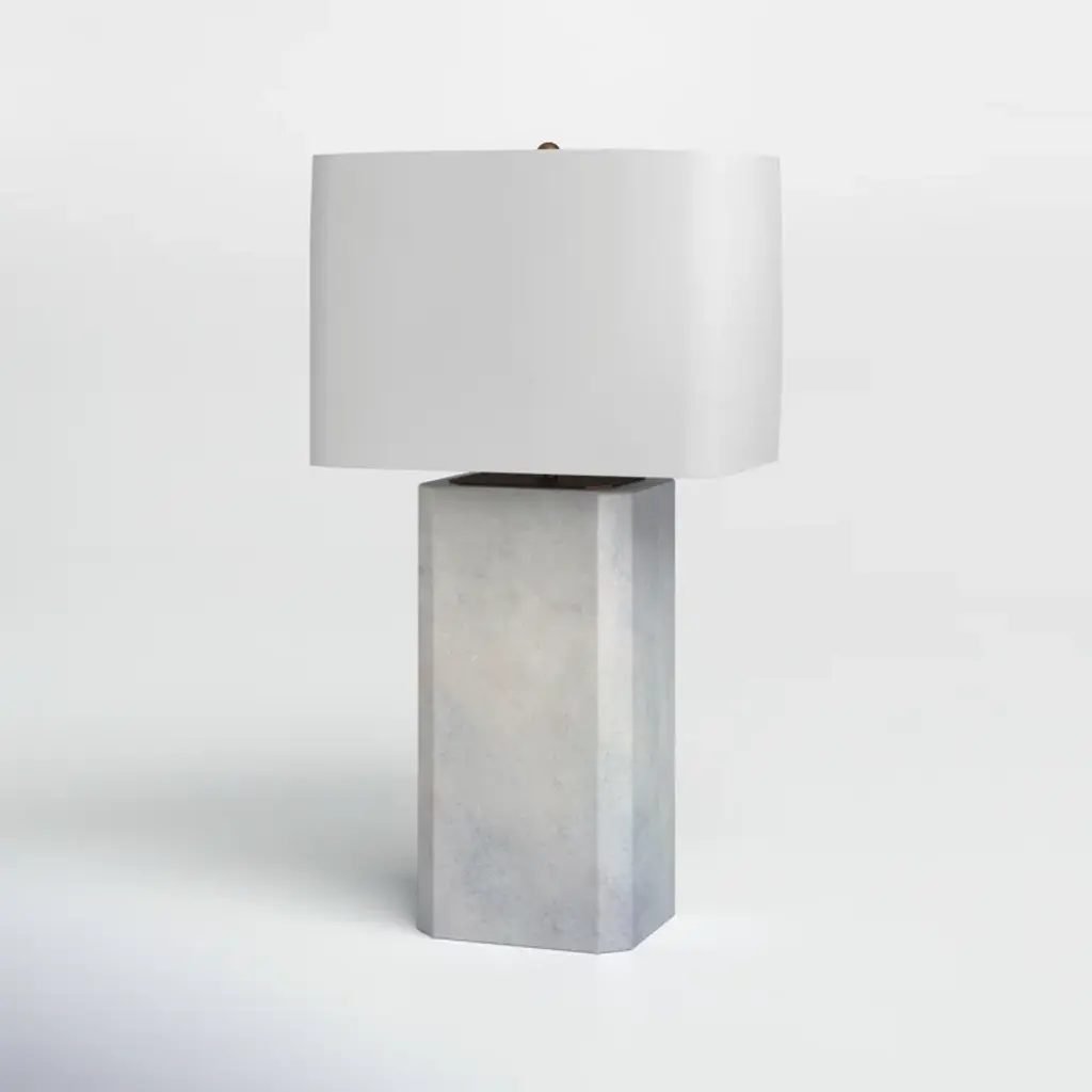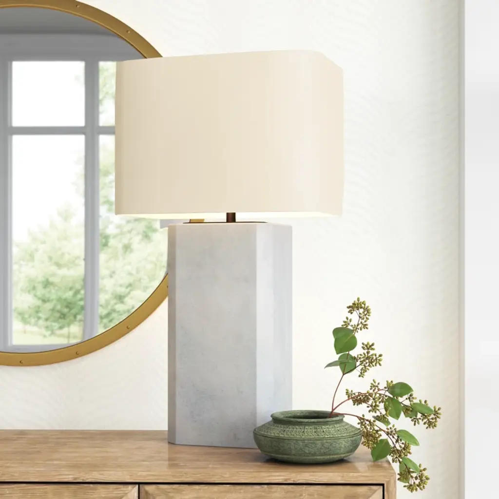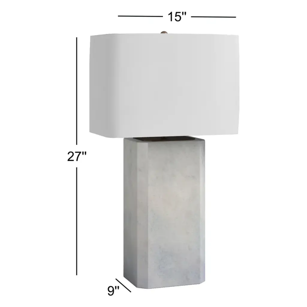 The Jadon table lamp is crafted of marble with a white rectangular shade. Finish: White. Material: Marble. Wattage: 100W max. Bulb type: A. Socket type: E26. The hand crafted details produced by a skilled artist lends itself to a unique technique and will vary slightly.