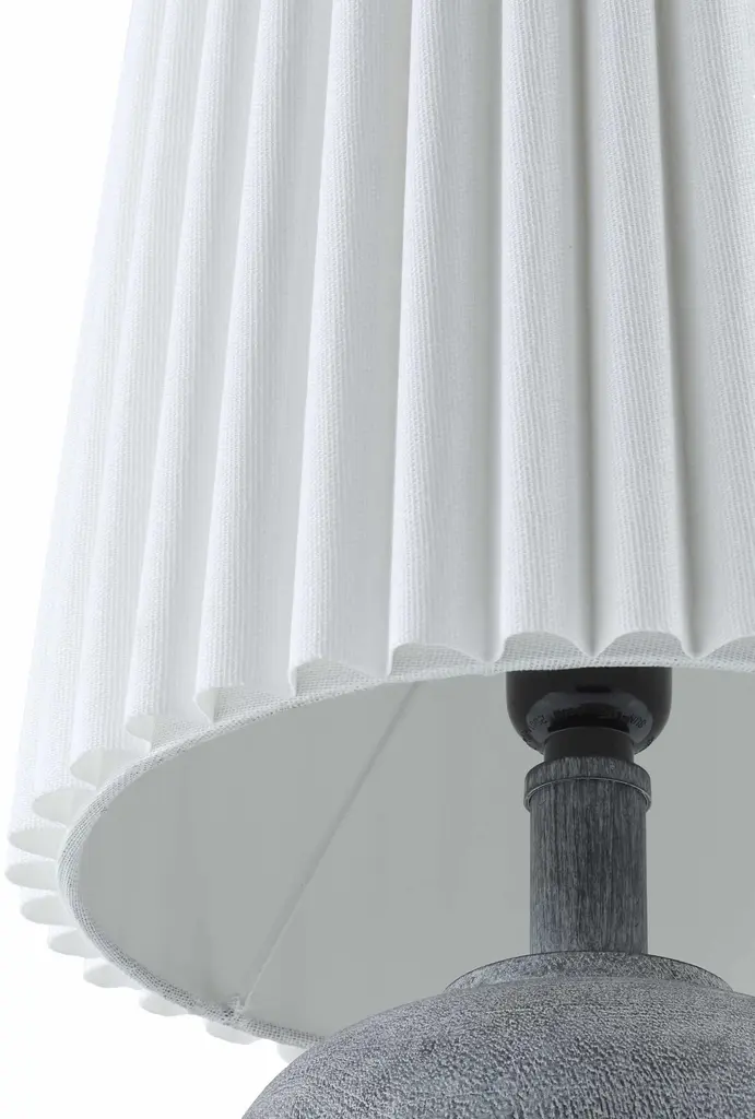 Collection: Jaltomate Colors: Gray, White, Translucent Material: Body: Resin,Shade (Outside): Linen,Shade (Inside): Polyester Made In: China Lighting Type: Accent Table Lighting Shade Material: LinenPolyester Shade Color: WhiteWhite Cord Length: 6' Switch Type: Rotary Number of Bulbs: 1 Socket Type: E-26 Bulb Wattage: 60W