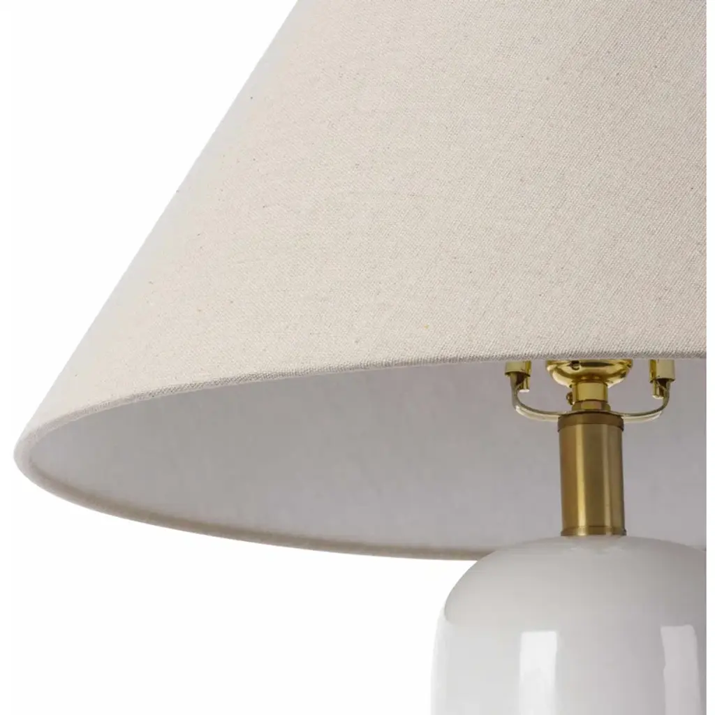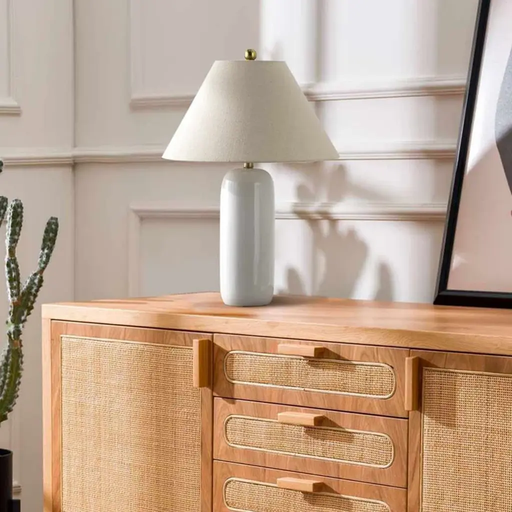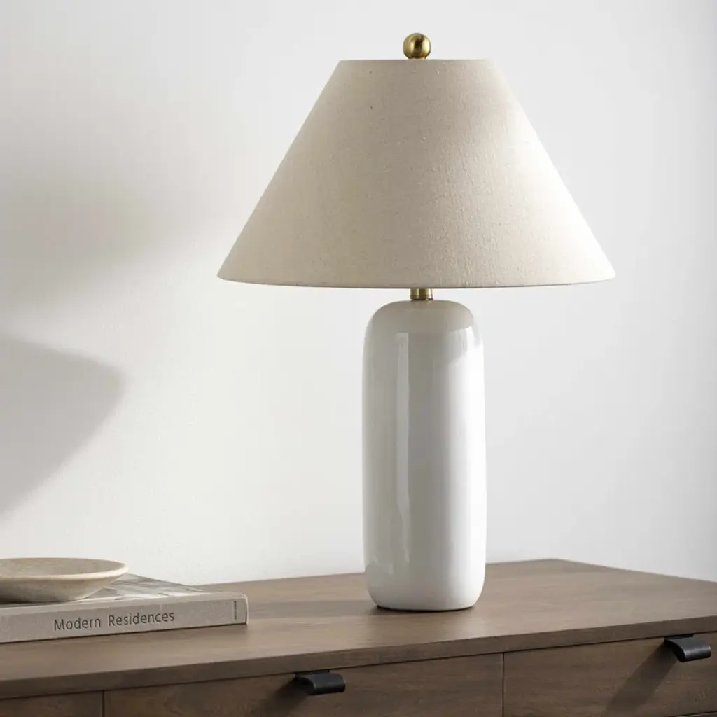 Glow with the flow. Our table lamp features a ceramic base in a crisp white hue, topped with a 100% linen empire shade in beige. The rounded base adds a touch of softness to your space, while the rotary socket switch makes it easy to control the light. Just add a standard E26 bulb (not included) to brighten up your room. Perfect for adding ambient lighting to any dry location. Plug-in power source with a black cord included.
