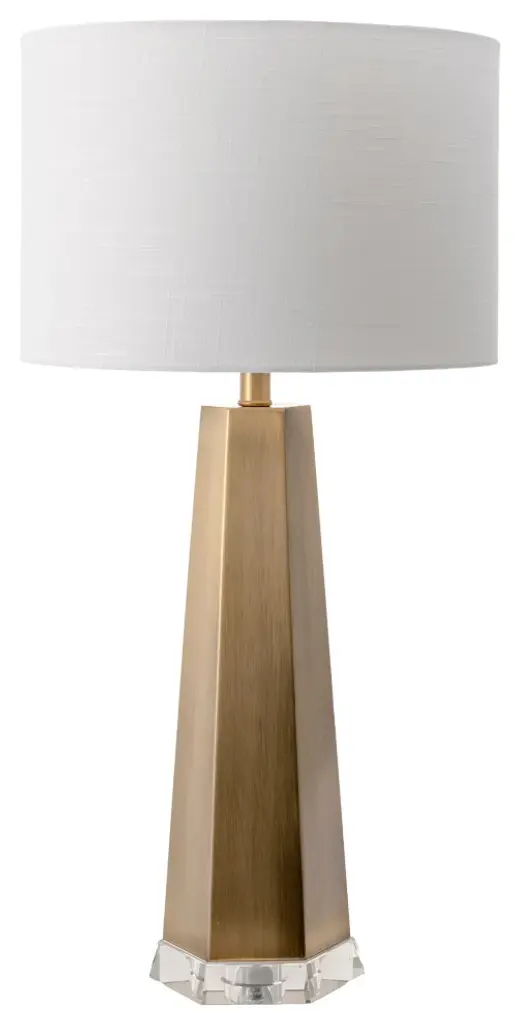 Crystal column lamp with aged gold leaf accents. Polyester hardback drum shade: 18"Dia. x 11"T. Uses one 100-watt bulb. Three-way switch. Overall: 18"D x 32"T. Cord length: 6 ft. Imported. Boxed weight, approximately 22 lbs. Ships via UPS Free shipping in the U.S.