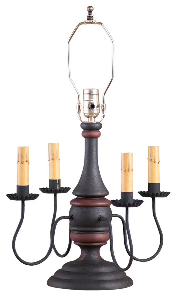 A finely crafted table lamp with 4 candelabra arms and a standard socket on top with 3 way lighting capability. Our Jamestown Lamp exudes a genteel country feeling like that on a gentleman''s farm or a plantation of the old South. Shade and lamp base sold separately. 4 candelabra arms, 60 watts maximum per socket. Center light has a standard socket, 150 watts maximum. Heavily textured Hartford Black w/Red Stripe. Handcrafted in Pennsylvania. This fixture is UL listed. Shown with a 15" Hartford shade which is sold separately.Bulbs Not Included