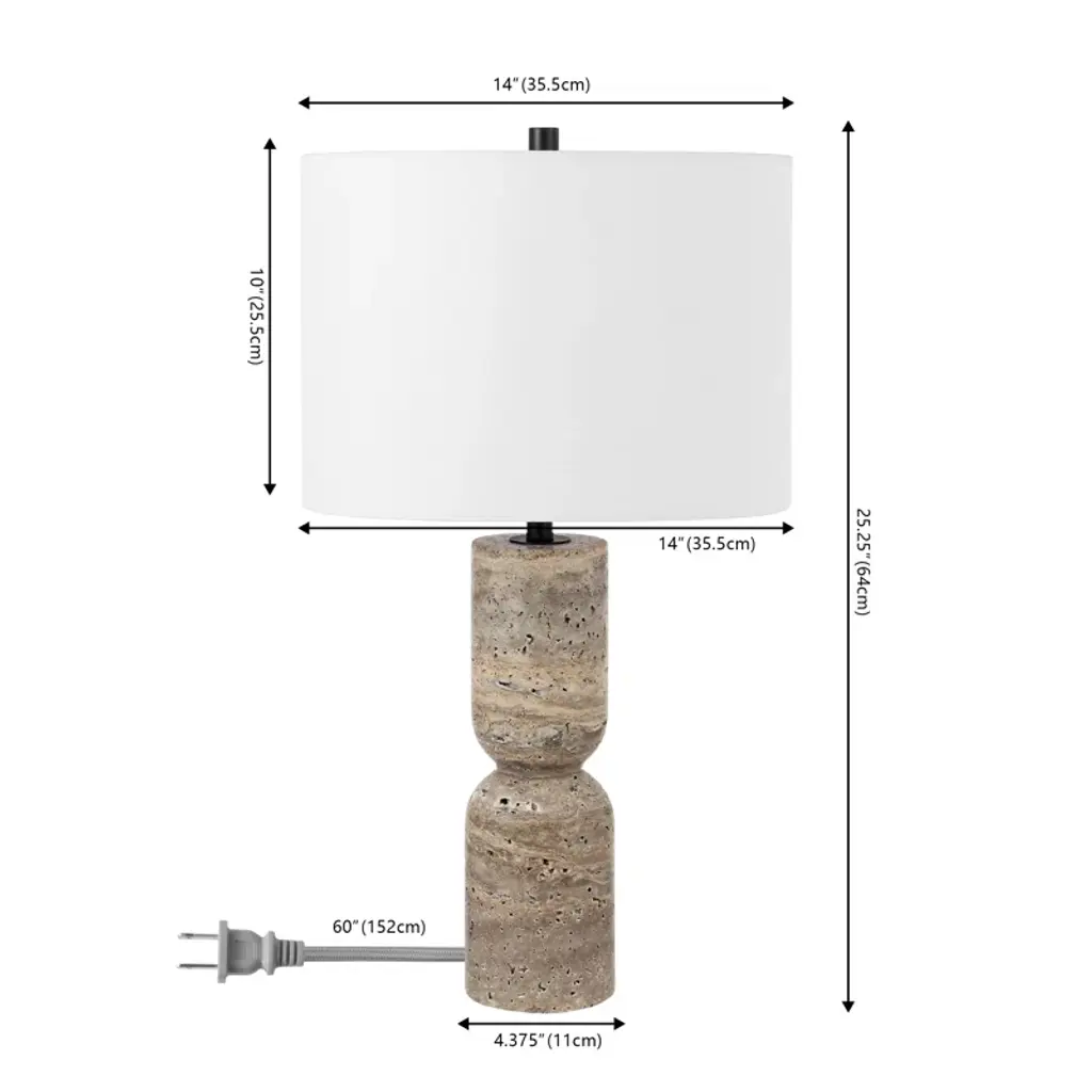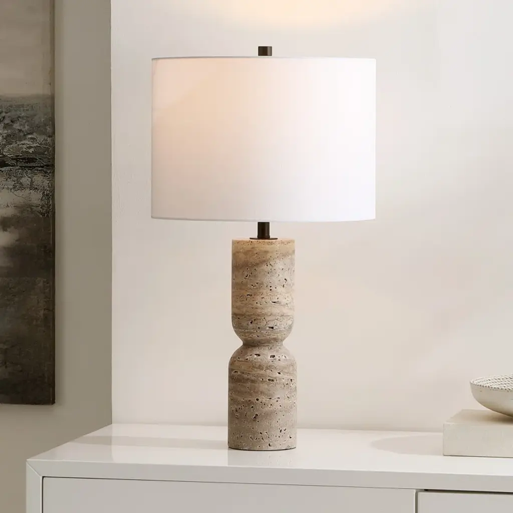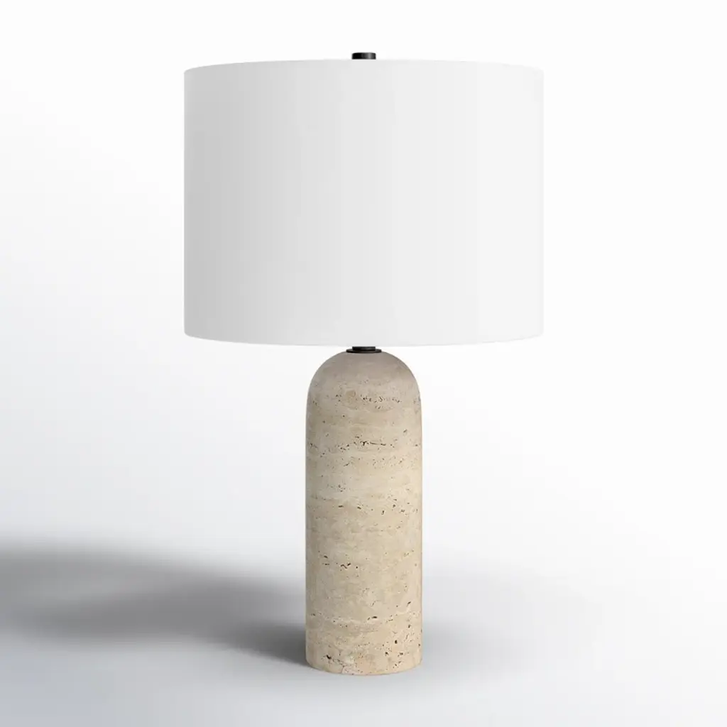 This table lamp effortlessly captures the essence of modern Scandinavian design with its sleek travertine base and minimalist silhouette. It's all about creating that cozy, inviting glow in your living room or bedroom. The lamp comes with a white cotton drum shade that diffuses light beautifully, setting the perfect mood for relaxation or reading. Equipped with an LED bulb, it provides ambient light while being energy-efficient. Plus, the on/off switch is conveniently located on the fixture for easy access.