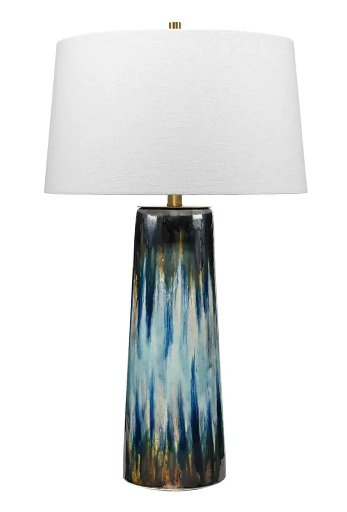 The abstract pattern on this dynamic table lamp creates the illusion of an oil painting on ceramic. Vertical brushstrokes of aqua, dark blue and metallic create the perfect canvas for a stunning table lamp. The pillar shaped lamp is paired with a wide, slightly tapered lamp shade in white linen to further enhance the silhouette. Handmade of ceramic 100% Linen White Cone Shade Lamp Dimensions: 20.5"H x 7" Diameter Footprint Shade Dimensions: 10"H x 18"W x 18"D, Top Diameter 16" 1 bulb required; Bulb Not Included 150 Max Wattage; 120 Volts E26 Bulb Base Type 8 Ft Clear Cord 3-way Switch