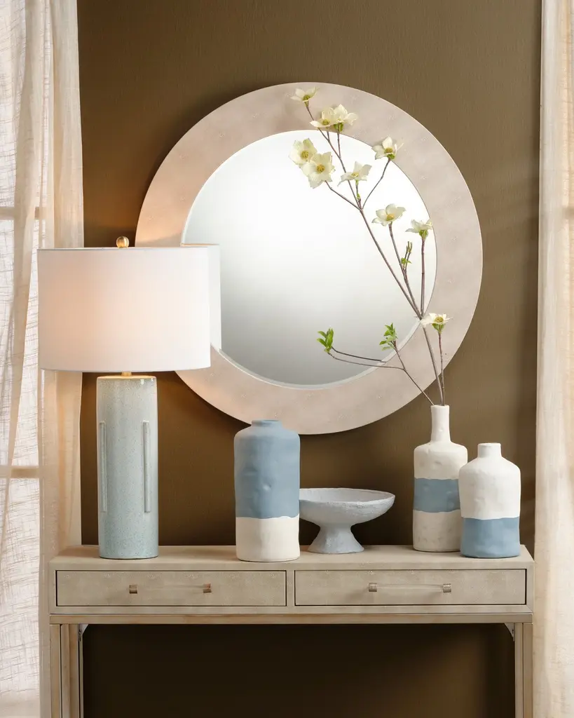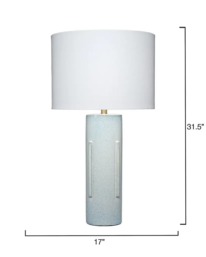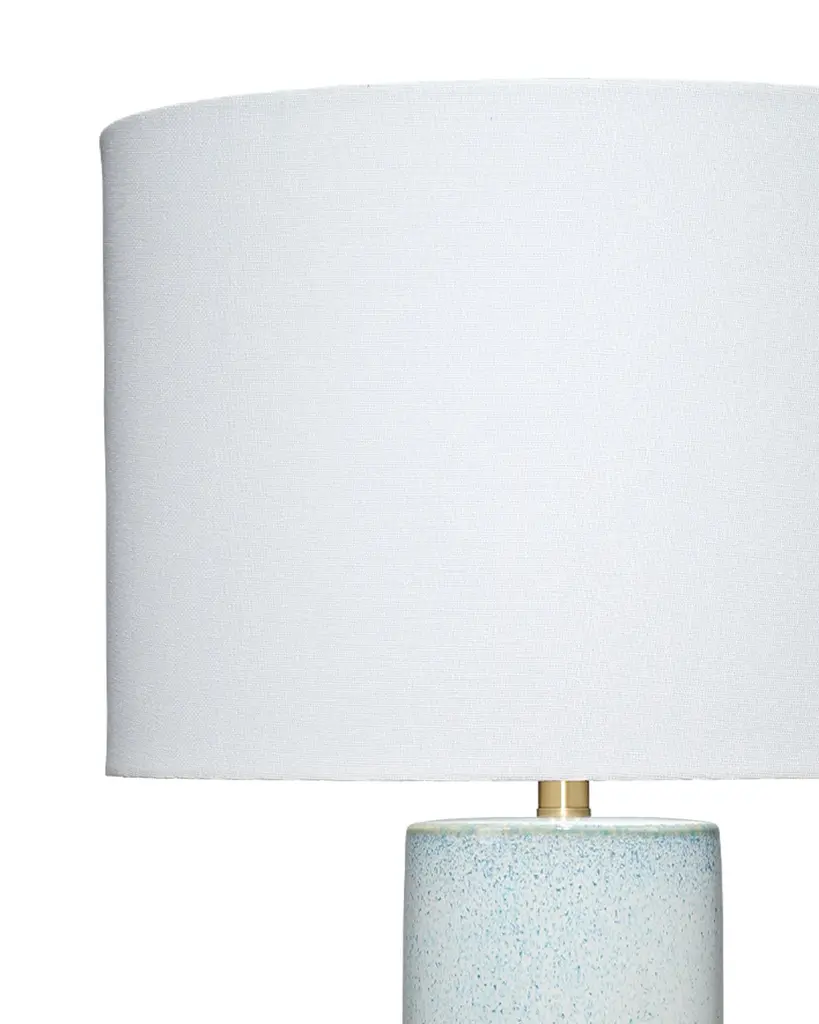 Finished in a gradient blue reminiscent of robin’s eggs and seafoam, this serene ceramic lamp is topped with a clean white linen drum shade. The inviting palette is continued with a silver-toned ball finial, harp, and spider. Somehow managing to be both cozy and sophisticated, it is perfect next to a white couch or in an entryway.