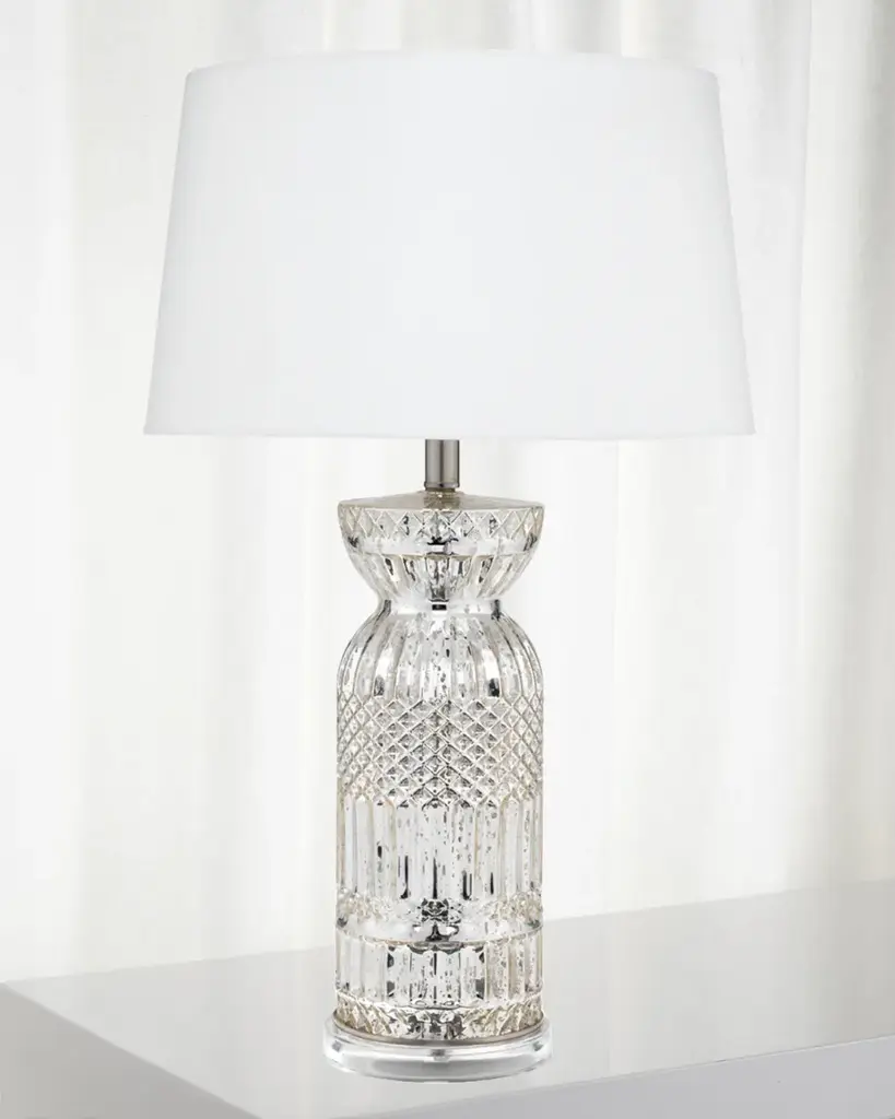 Add a touch of luxury and drama to any room with this accent lamp. Its traditional urn shape is made of mercury glass that draws the eye and reflects light around the room and the clear acrylic base gives it an elevated presentation. Topped with a linen shade, this table lamp will be the main focus in your home. Glass table lamp on acrylic base. Linen shade dimensions: 17"Dia. (15" at top) x 10"T. Overall: 17"Dia. x 25"T. Cord length: 8 ft. Uses one 150-watt bulb. Three-way switch. UL listed. Imported. Boxed weight, approximately 4 lbs. Shipping Direct from Vendor, usually ships within 10 business days. About Jamie Young: In 1997, Jamie Young Jeter and David Jeter took a day trip to Mexico, where they filled their car trunk with gardening pots they discovered in a roadside shop. When they returned to Los Angeles, they promptly sold the entire haul to a local florist. Recognizing an under-served market, the two artists began to design and produce their own line of interesting flower pots, only to discover that the rustic, handcrafted quality of the pieces would make unusual bases for lamps—thus the Jamie Young Company was born.