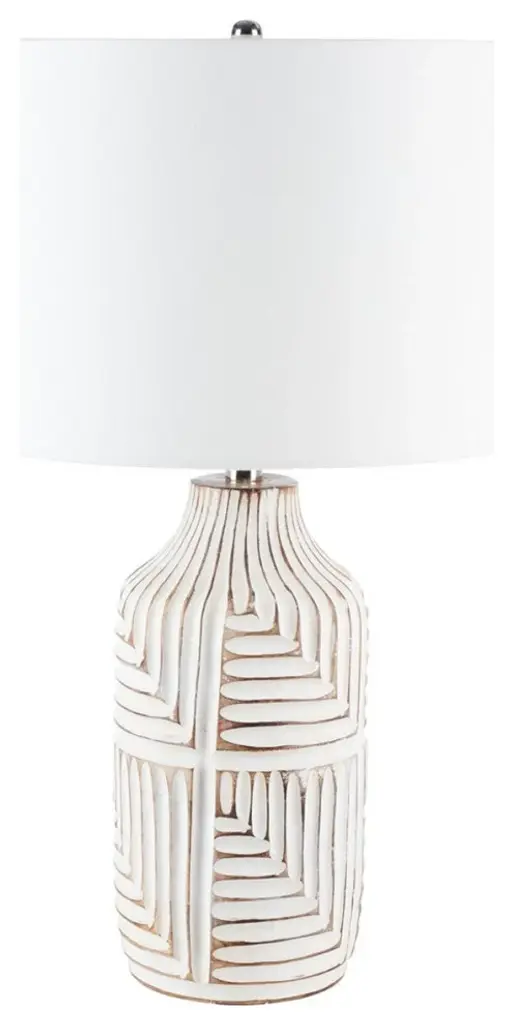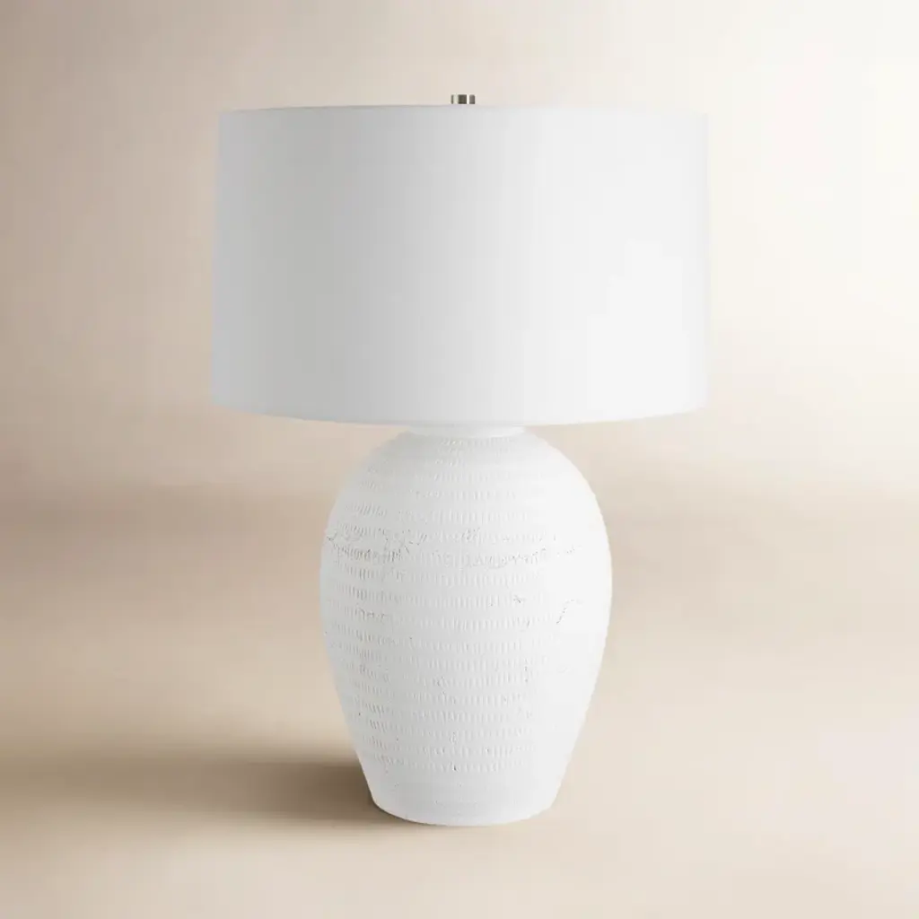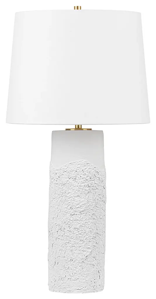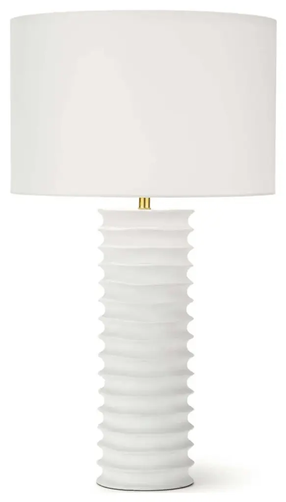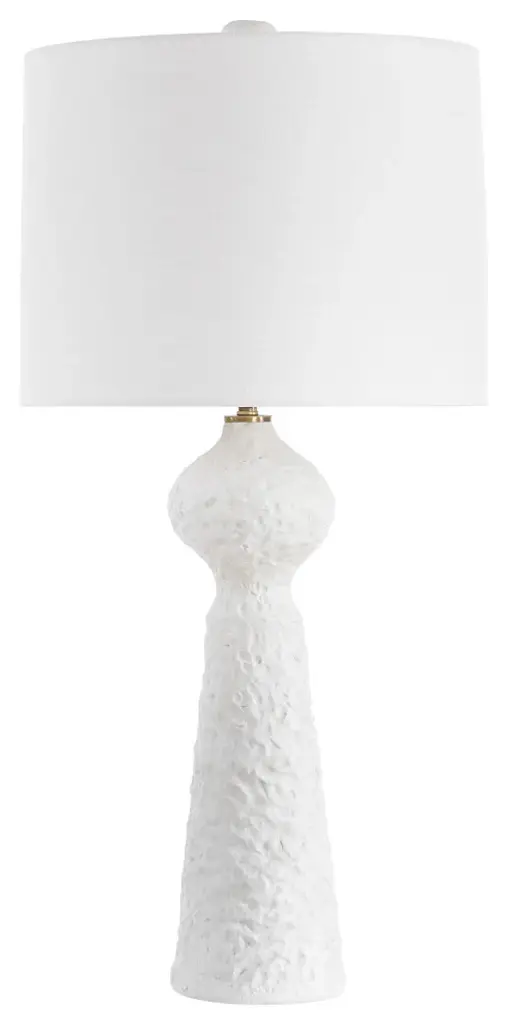 The white-on-white palette of this crisp, clean lamp is broken only by the small splashes of brass provided by the harp, spider, and cylinder finial. Each is artisan created of quality resin and topped with a white linen drum shade with a rolled edge. Casual and comfortable but also very stylish, it is an easy choice for any modern home.