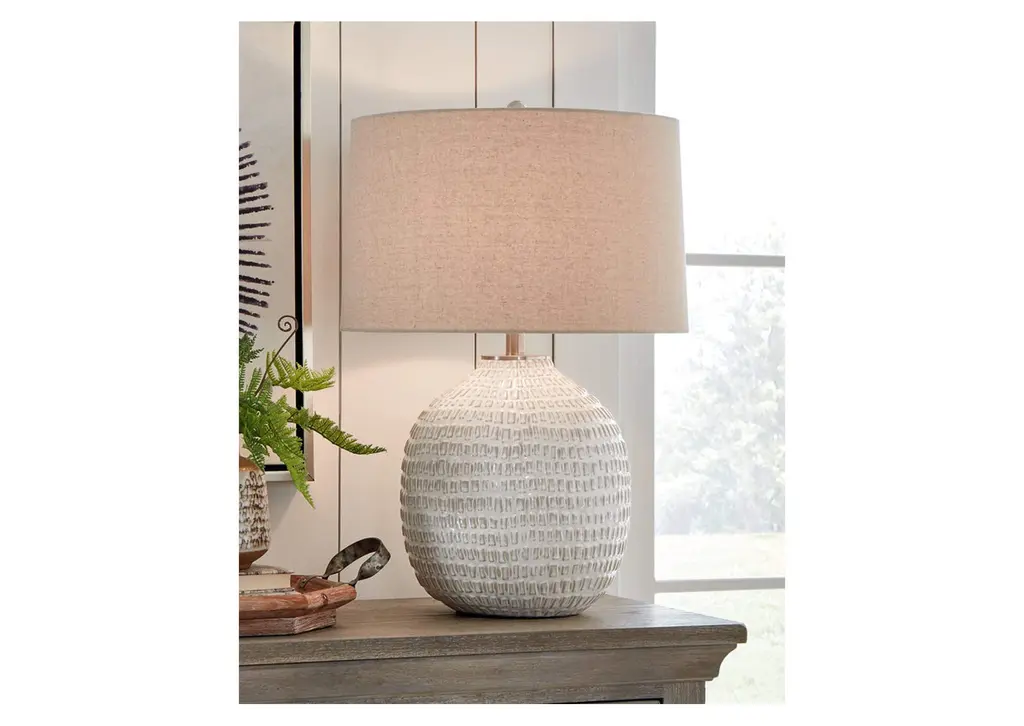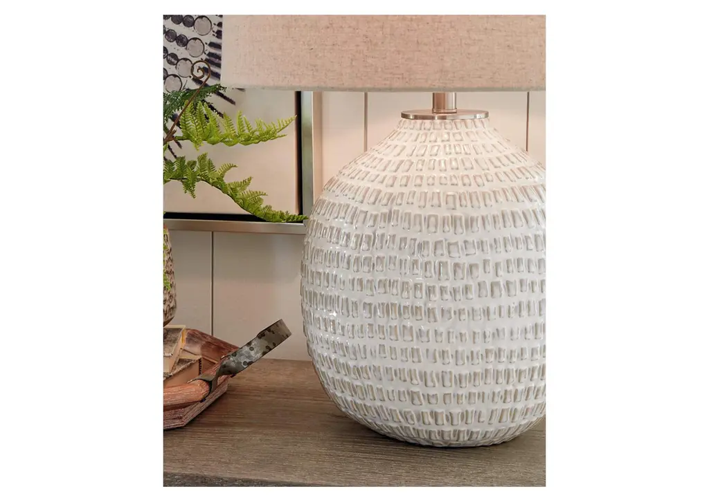 Style and function come together in the Jamon textured ceramic lamp to bring incandescent style to any space in your home. Combining a rounded base, accented with goldtone hardware, this lamp is capped off with a simple natural lampshade for complete elegance. Pair with a wide variety of furniture styles for a versatile indoor lighting option you'll love. Weight 13.000 lbs. (5.85kgs.)