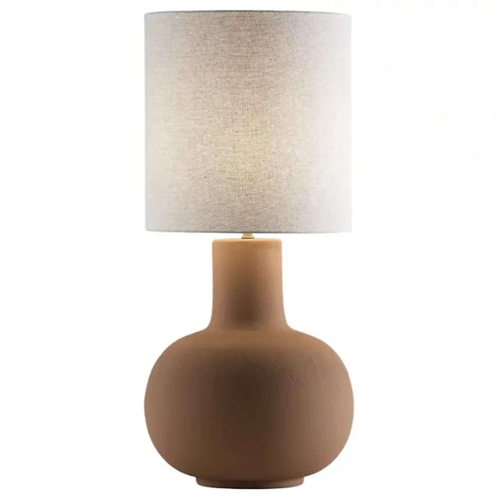 The orange version of the Janeen Table Lamp is a throwback to the 1960s when design was groovy and our cultural mores were tripping the light fantastic! The terracotta lamp, which stands 31 inches tall, has been treated to a vibrant orange finish. The metal hardware has a satin black finish and the lamp is topped with a flax linen drum shade that illuminates this nod to kicky pottery of the past. We offer the Janeen in a number of colors.