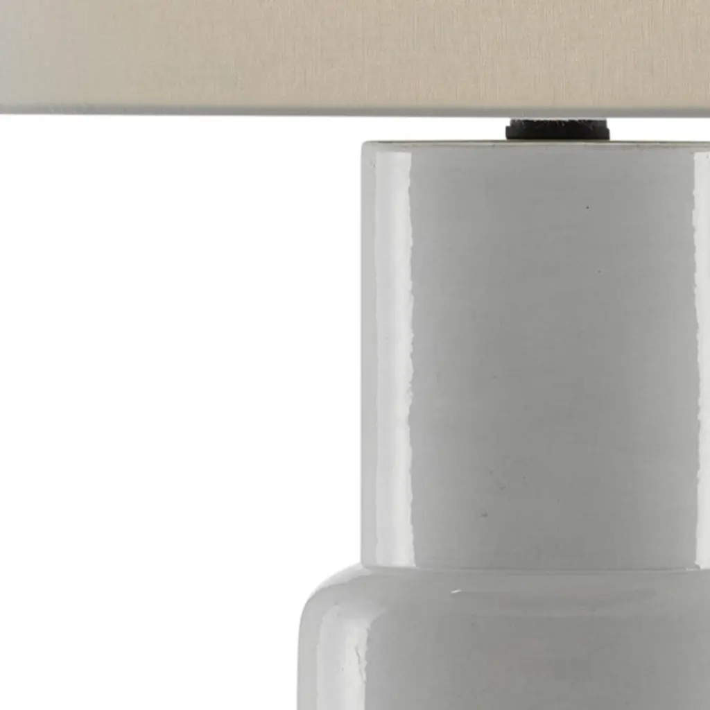 The Janeen Table Lamp is a terracotta lamp that embodies a nod to kicky pottery of the past. It features metal hardware with a satin black finish and is topped with a linen drum shade, providing a warm and inviting illumination.