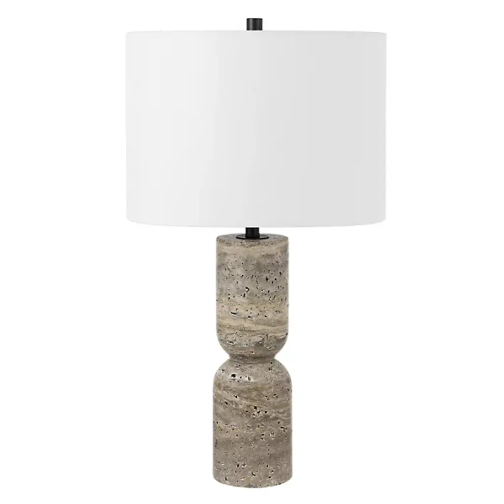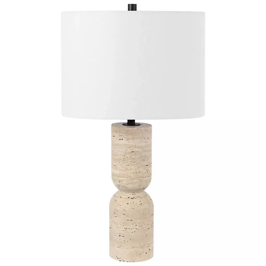 The Janis Table Lamp from Alder & Ore illuminates its surroundings with inspired, sculptural simplicity. The fixture features a distinctive hourglass-shaped body made from travertine. The natural beauty of the textured travertine surface makes each lamp unique, while the hazy fabric shade softens the light, creating an inviting warmth around the fixture. The lamp is compatible with a broad range of decor styles, from rustic to modern minimalist, and can enhance transitional and mid-century modern aesthetics.