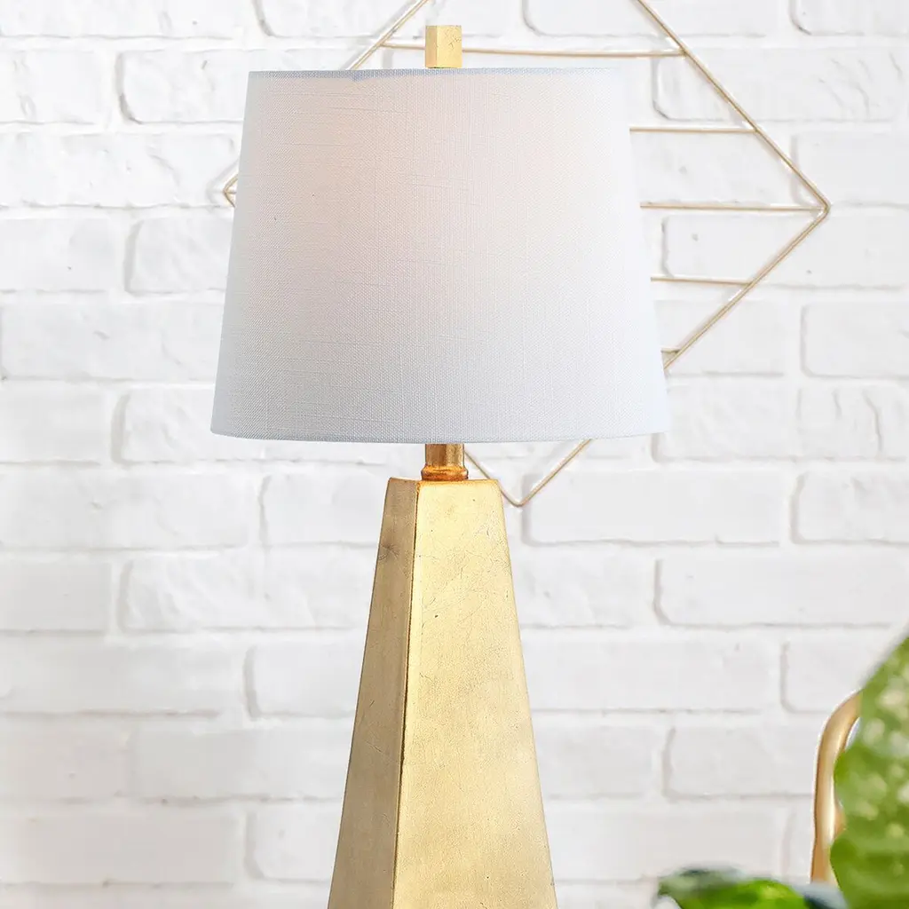 A stunning geometric classic -- this pyramid base table lamp shines in gold paint. At 20.5" tall, its scale is perfect for pairing as lamps for your nightstands or on either side of a buffet. And the designer touches extend all the way to the plug -- the cord is silk wrapped for style and safety.