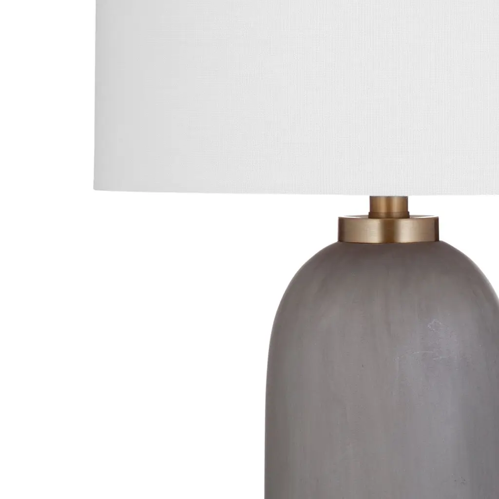 The Jason Table Lamp blends industrial edge with refined detailing. Crafted of textured gray cement and accented with warm brass, it strikes a bold yet balanced silhouette. A classic drum shade softens the look, casting a warm, ambient glow. Perfect for adding depth and character to modern, minimalist, or eclectic interiors.