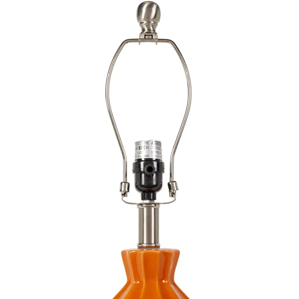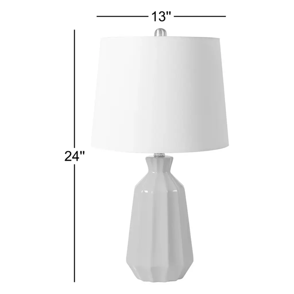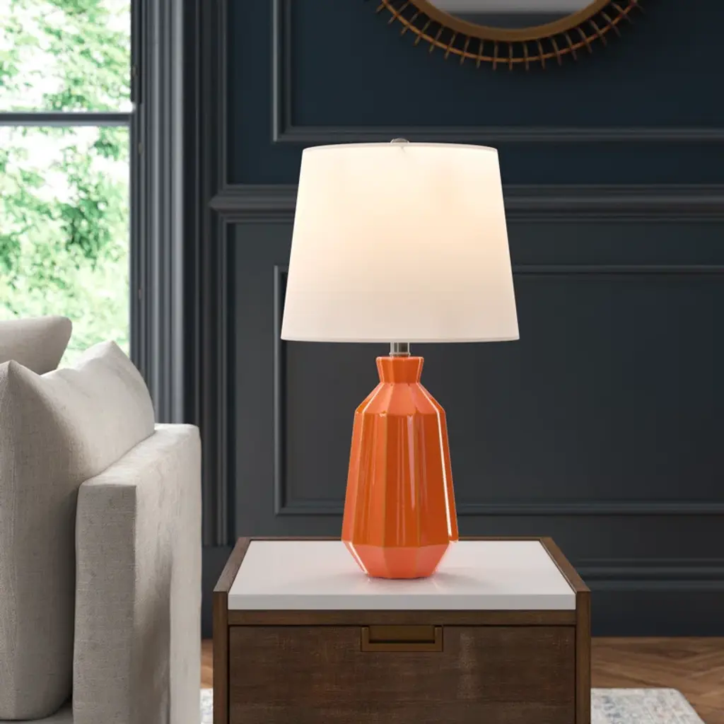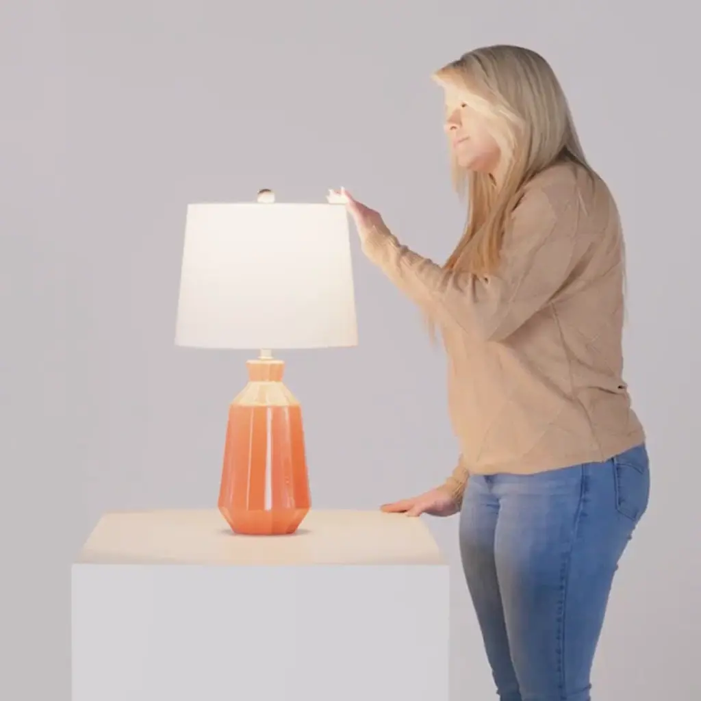 A colorful palette and textured design add a fun detail to your living room or bedroom with this stylish accent lamp. It has a ceramic base with a bright glaze and raised lines that bring a tactile look to your space. This lamp's base also has a tapered bottom that reminds us of a flower vase. A white linen drum shade helps diffuse the ambient glow from a single 100W max bulb, which is sold separately. Plus, this table lamp features a 3-way switch that lets you adjust the light to your liking.