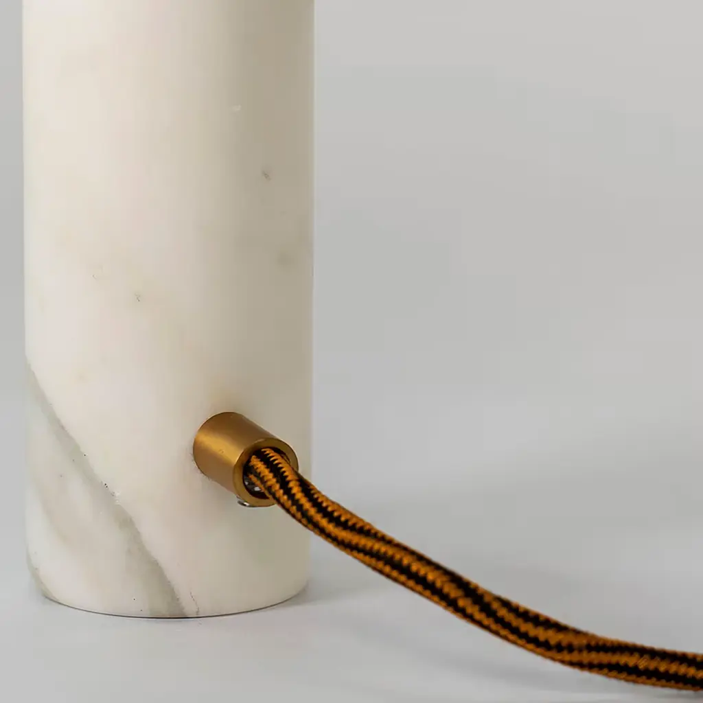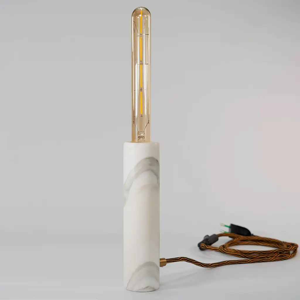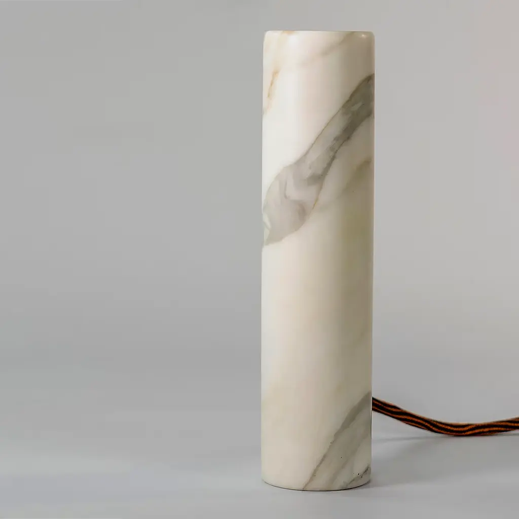 Ideal to accent a nightstand or working desk in a private study, this exquisitely contemporary table lamp flaunts a playful design inspired by the iconic sword used by Jedis in the renowned movie saga of Star Wars. A slender LED lightbulb simulating the laser ray stems from a sleek cylindrical base in matte-finished, white Calacatta marble, showcasing a natural gray tracery of extraordinary delicacy.