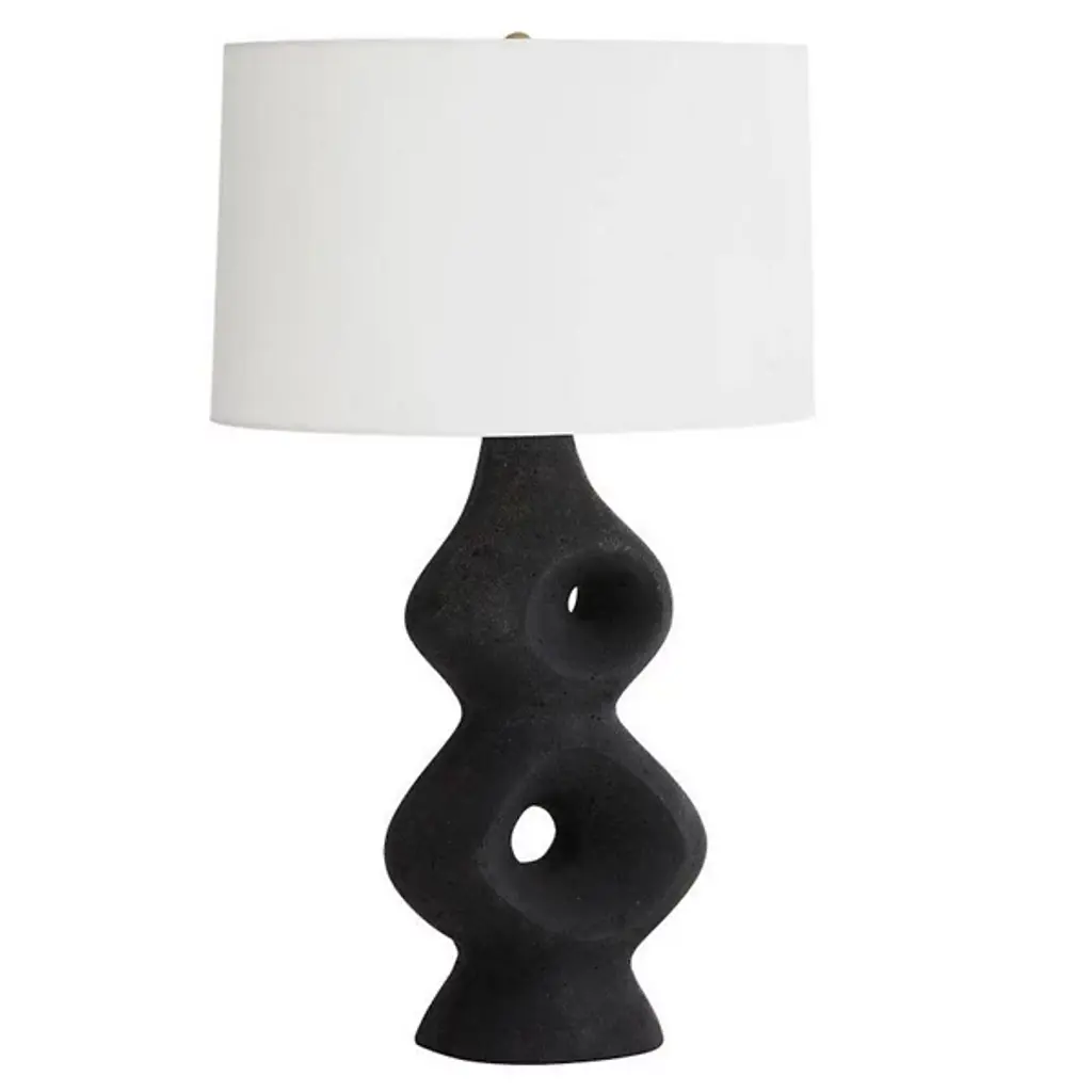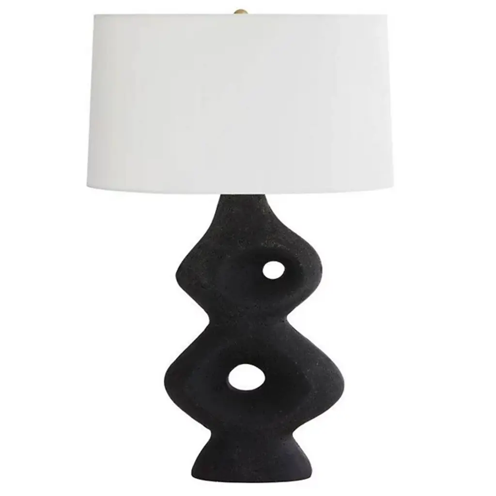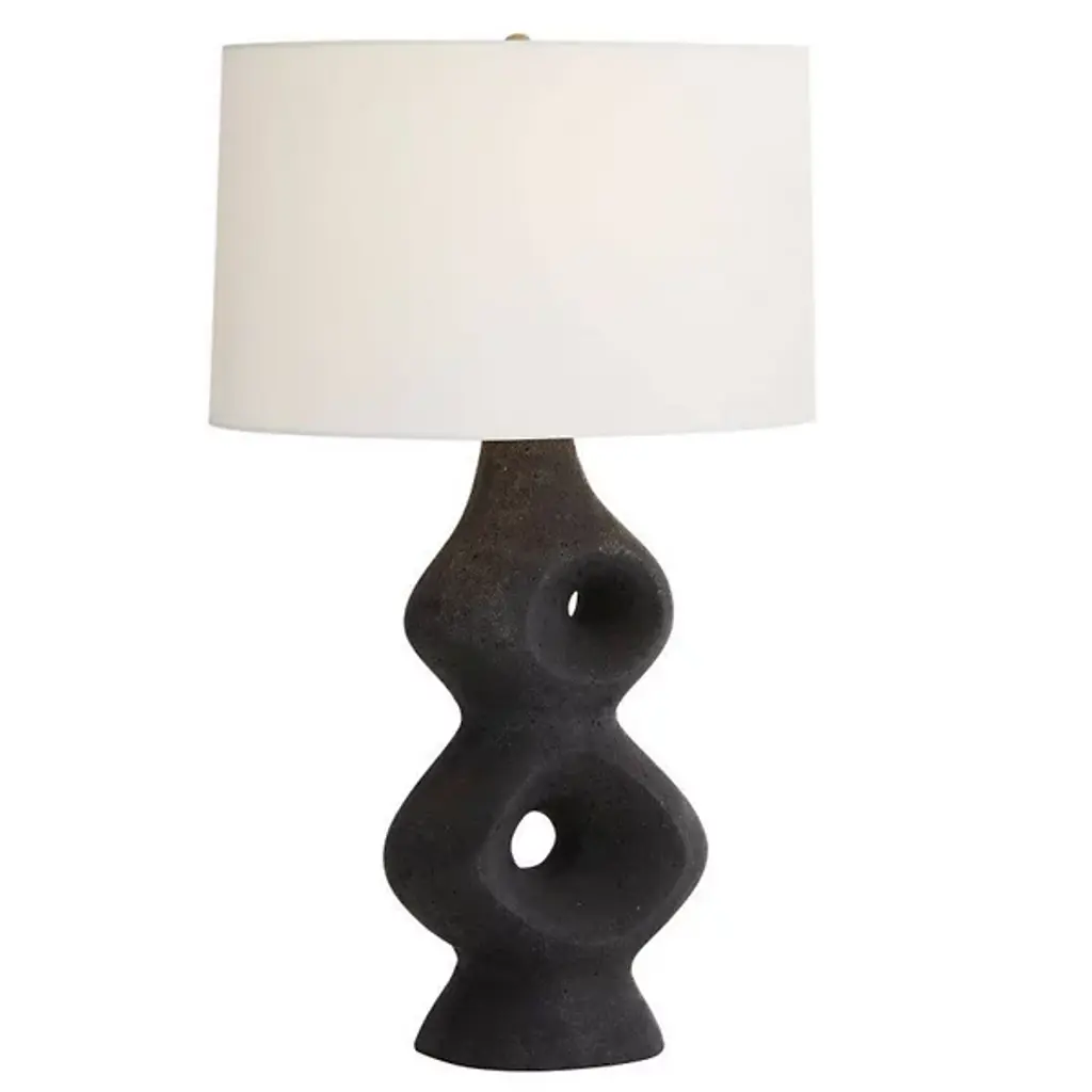 The Jemai Table Lamp from Arteriors challenges conventional symmetry with its stacked, asymmetrical oval forms crafted from charcoal ricestone. This lamp's volcanic-inspired base creates a dramatic profile that becomes even more dynamic when illuminated, as light highlights the sculptural negative space between the distinctive shapes. The antique brass sphere finial provides a deliberate contrast to the lamp's angular nature. Its black cloth cord integrates seamlessly with the dark base. The microfiber shade diffuses light evenly over side tables, desks, and consoles.
