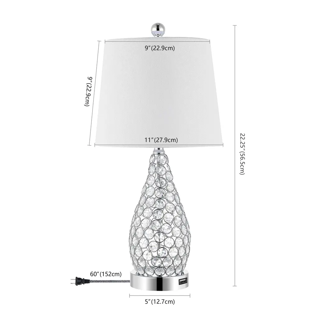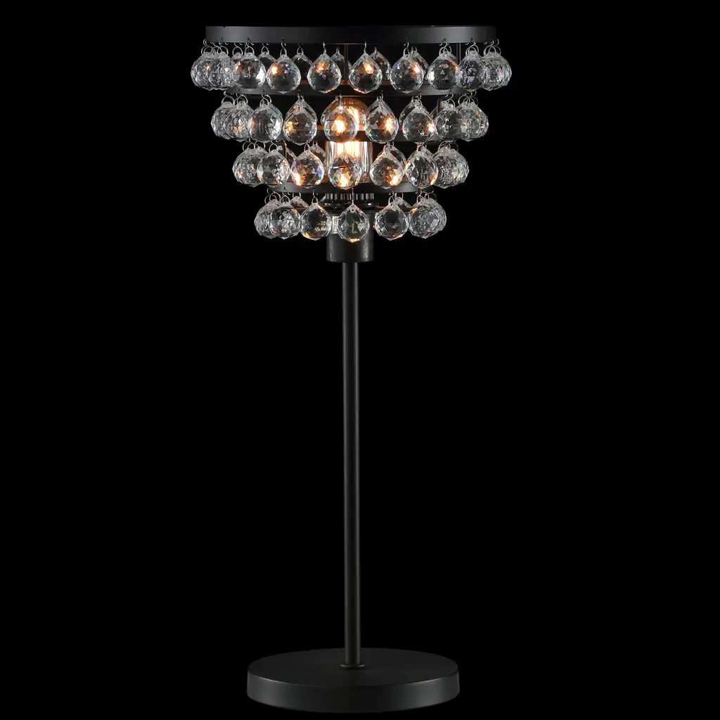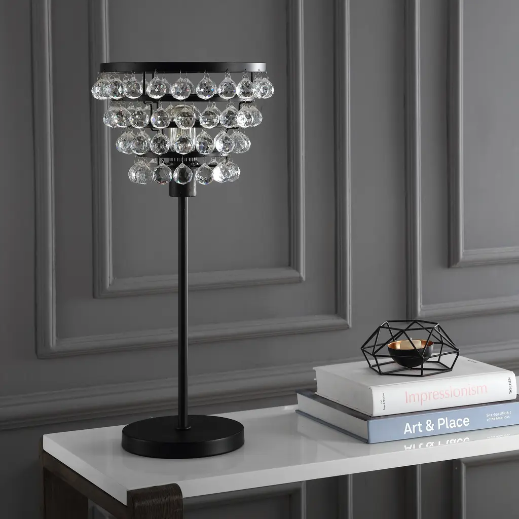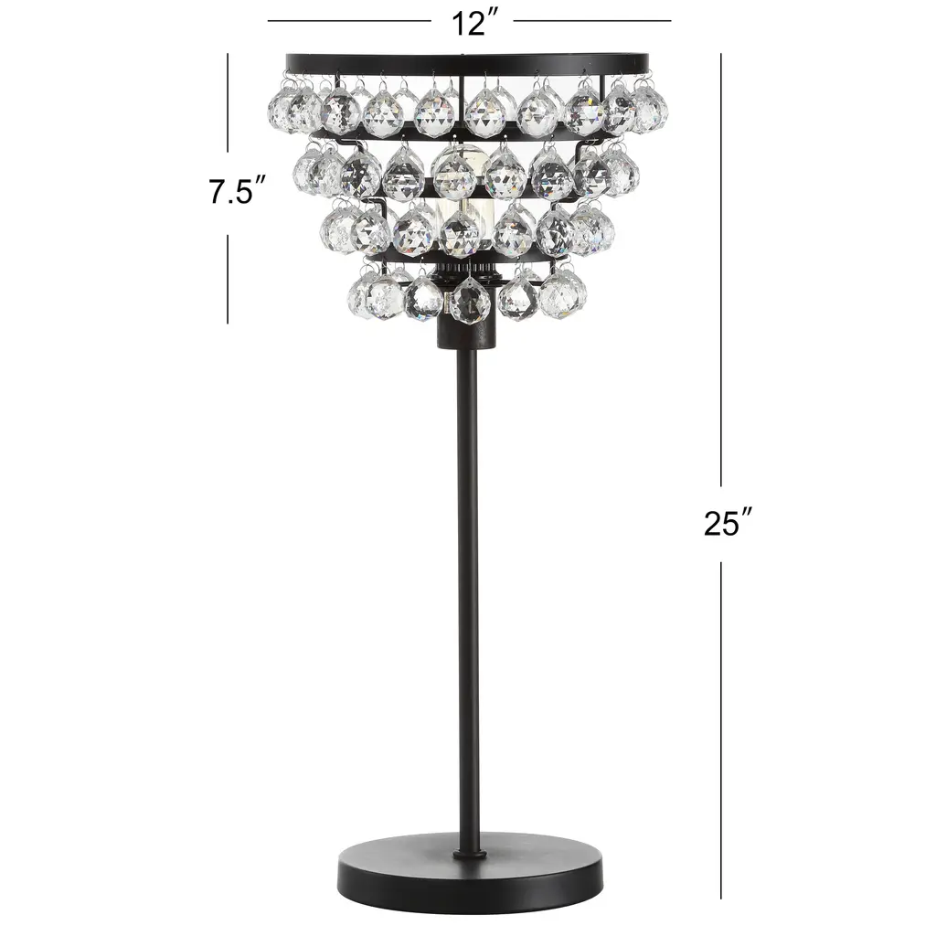 Equivalently glamorous and industrial, this table lamp shines with its faceted clear beads and bronze frame. Included is a 60W Edison Bulb which adds old-fashion charm and a warm glow to its contemporary stylings, making it an eclectic piece to add to any space. We love a pair of them on nightstands or atop a sideboard, but each lamp is sold individually.Features:Dimensions:About us:You see a lamp.We see a decorative work of art.A perfectly curved shade casts a dramatic shadow on a floor. A silk cord you never want to hide. LED lightbulbs: as easy on the environment as they are on the eyes. The JONATHAN Y Lighting collection considers every detail from impeccably sourced materials to designer styling. And our prices are so attractive, we've transformed a functional necessity into a fashion accessory.JONATHAN Y Lighting - a fashion revolution in home decor.