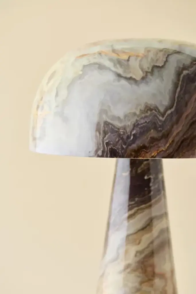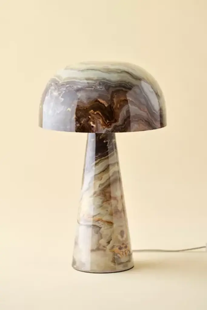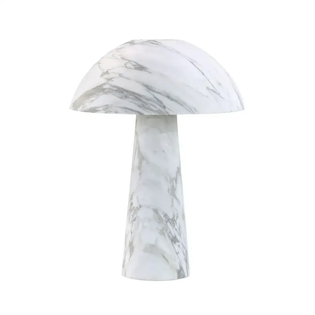 Create a statement lighting display in your living space with this chic-meets-retro lamp featuring a mushroom-inspired silhouette. Perfect to display as a bedside lamp or on your console tables, this metal lamp features a tapered base with an oversized dome-shaped shade with unique veining patterns allover the lamp. **Features** \- Jenna Marbled Table Lamp \- Iron statement lamp in a mushroom-like silhouette \- Requires one E26 bulb - not included \- Plug in; inline switch **Content + Care** \- Iron \- Wipe clean \- Imported \- Made in compliance with US electrical standards. To use this item outside of the US, pair with an outlet adapter and voltage converter made specifically for use in your location. **Size** \- Wattage: 40W \- Overall dimensions: 10"l x 10"w x 16.25"h \- Cord length: 6 ft \- Weight: 3.9 lbs \- Shipping package dimensions: 11.8"l x 11.8"w x 10.9"h \- Shipping package weight: 6.1 lbs