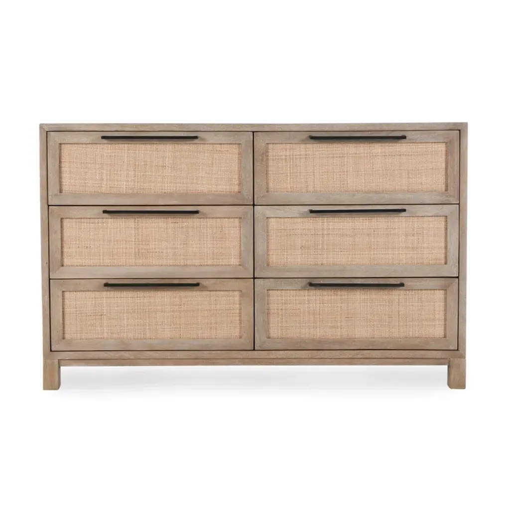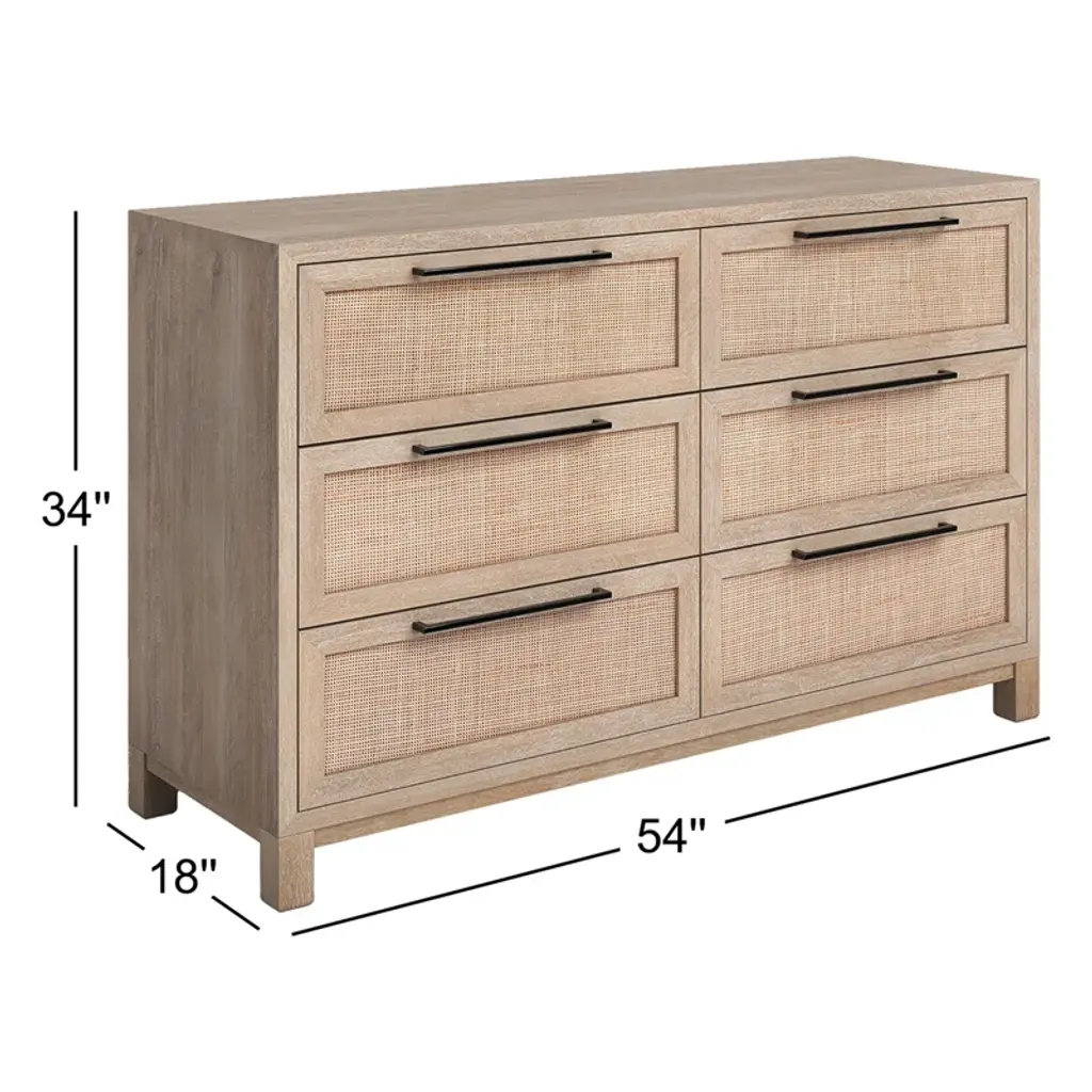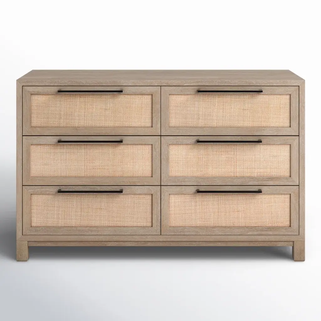 This 6-drawer dresser features classic caning for a touch of texture and visual interest in your bedroom. Crafted from solid mango wood, it showcases a soft taupe finish that highlights the natural look of the wood. This dresser features six spacious drawers with woven fronts and metal slides, providing ample storage for your clothes, linens, and accessories. We love that the slim black drawer handles add a modern contrast to the wood. Plus, there's room on the top for accent pieces and a table lamp.