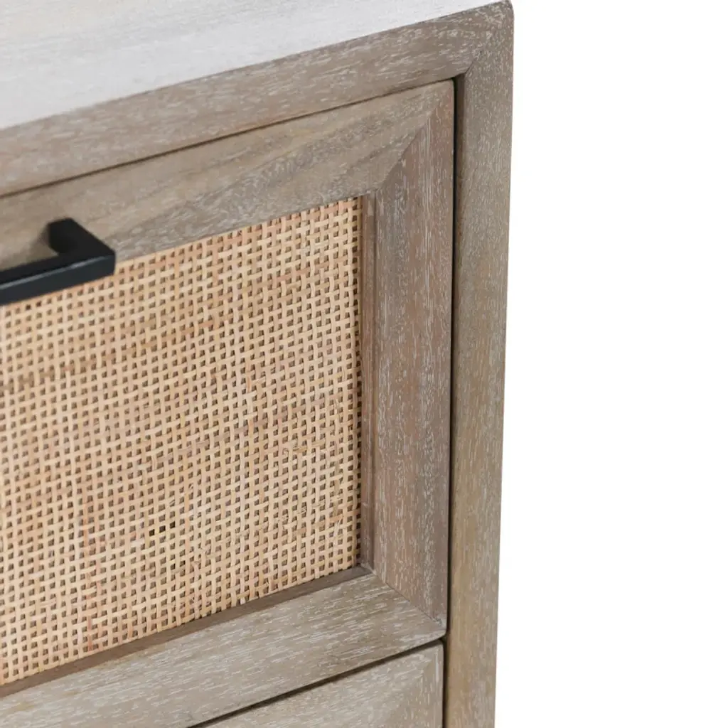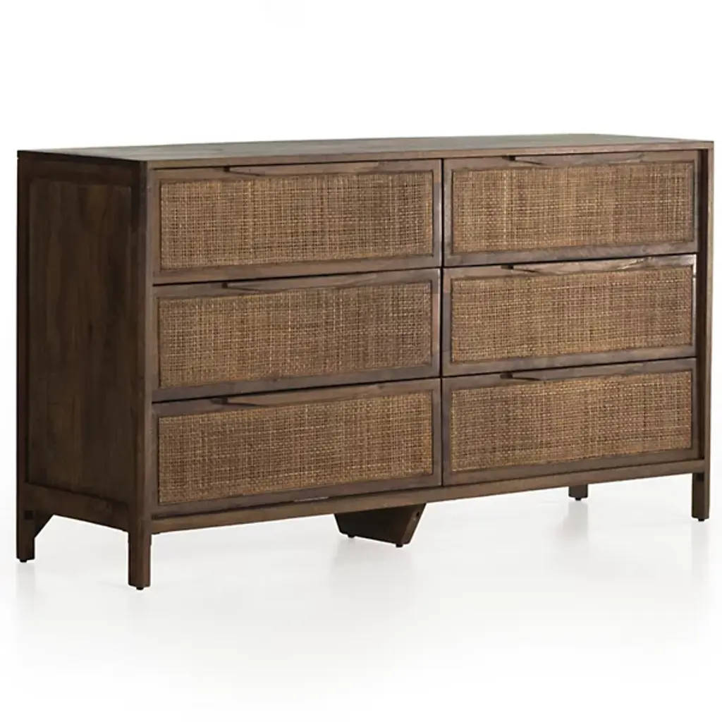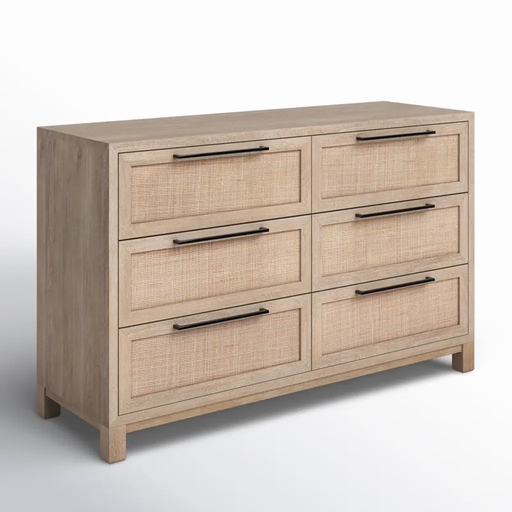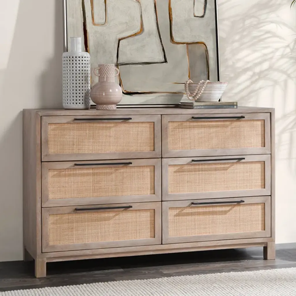 This 6-drawer dresser features classic caning for a touch of texture and visual interest in your bedroom. Crafted from solid mango wood, it showcases a soft taupe finish that highlights the natural look of the wood. This dresser features six spacious drawers with woven fronts and metal slides, providing ample storage for your clothes, linens, and accessories. We love that the slim black drawer handles add a modern contrast to the wood. Plus, there's room on the top for accent pieces and a table lamp.