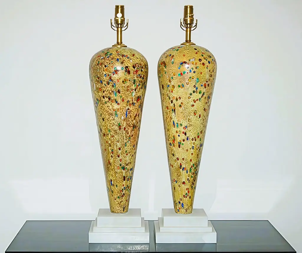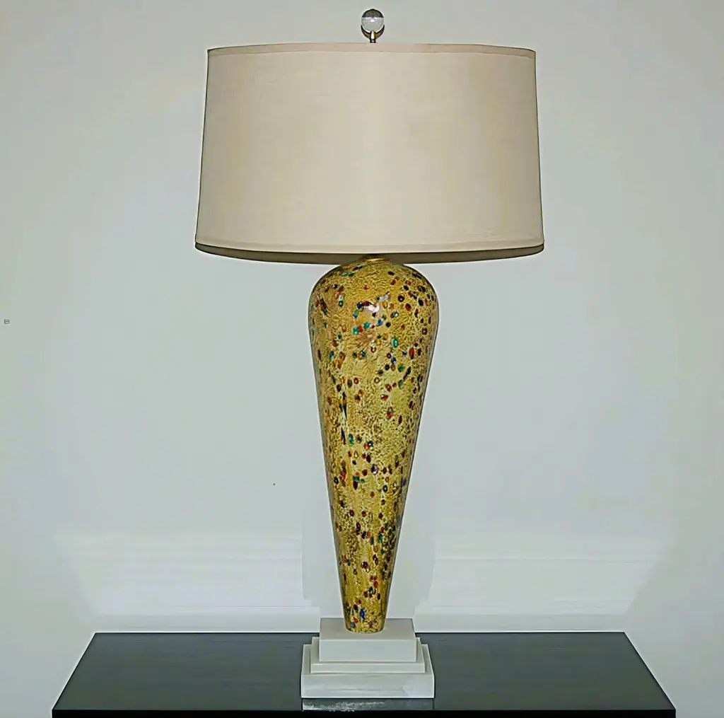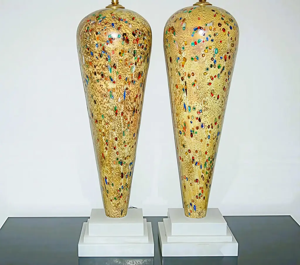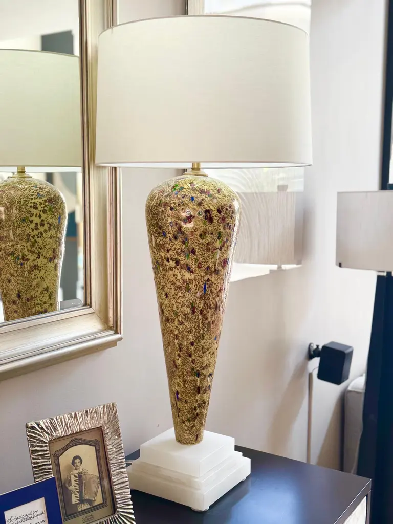 Here are the most spectacular Murano lamps we have, in a wonderful DIJON color. It appears that glass jewels were rolled into the molten glass at such a high temperature that they themselves melted and distorted. There is also some sort of precious metal rolled onto the glass – our best guess is either silver or platinum. These lamps dazzle and are meant for a very special home! The base is Italian alabaster.