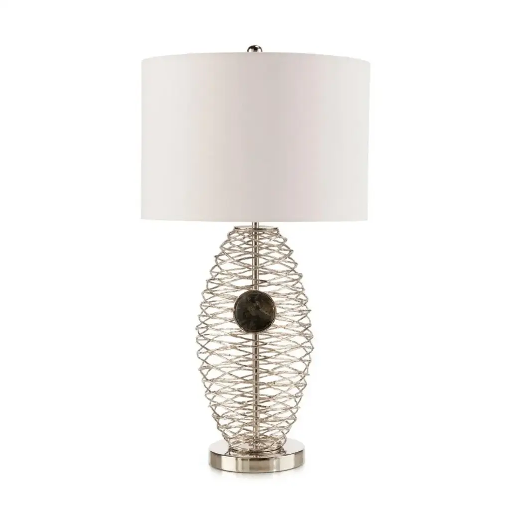A breathtaking statement piece, the Jewel Table Lamp is defined by a gorgeous, winding body of brass in a polished nickel finish. At the center of the piece, a pendant of natural labradorite stone showcases stunning, multi-colored textures that communicate a wealth of depth and texture to an interior space. The piece is supported by a rounded base, matching the polished nickel body, imbuing the body in its entirety with a lustrous metallic sheen. A rounded nickel finial adorns the apex, completing the look of this gorgeous turnkey lamp.