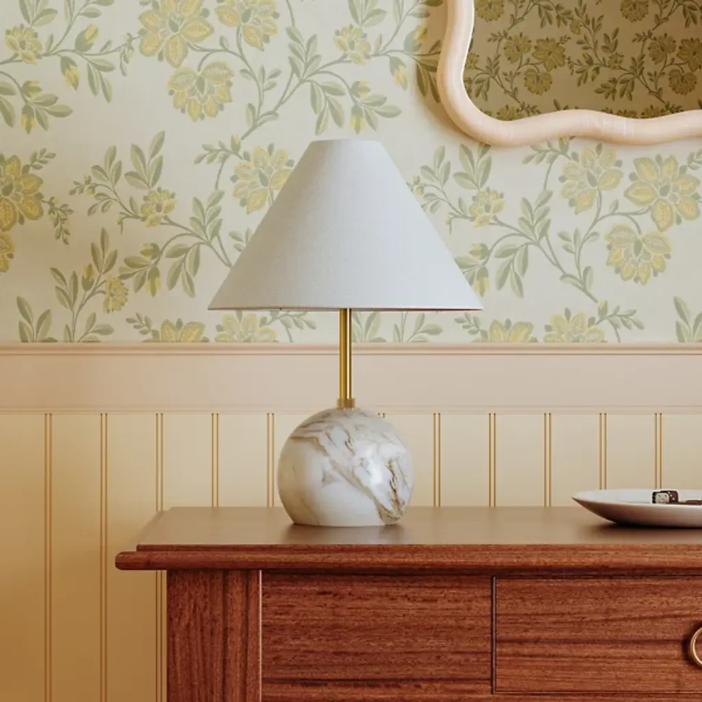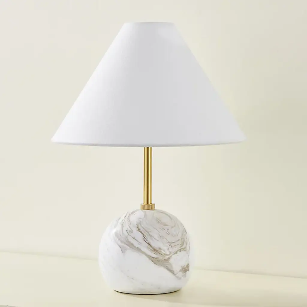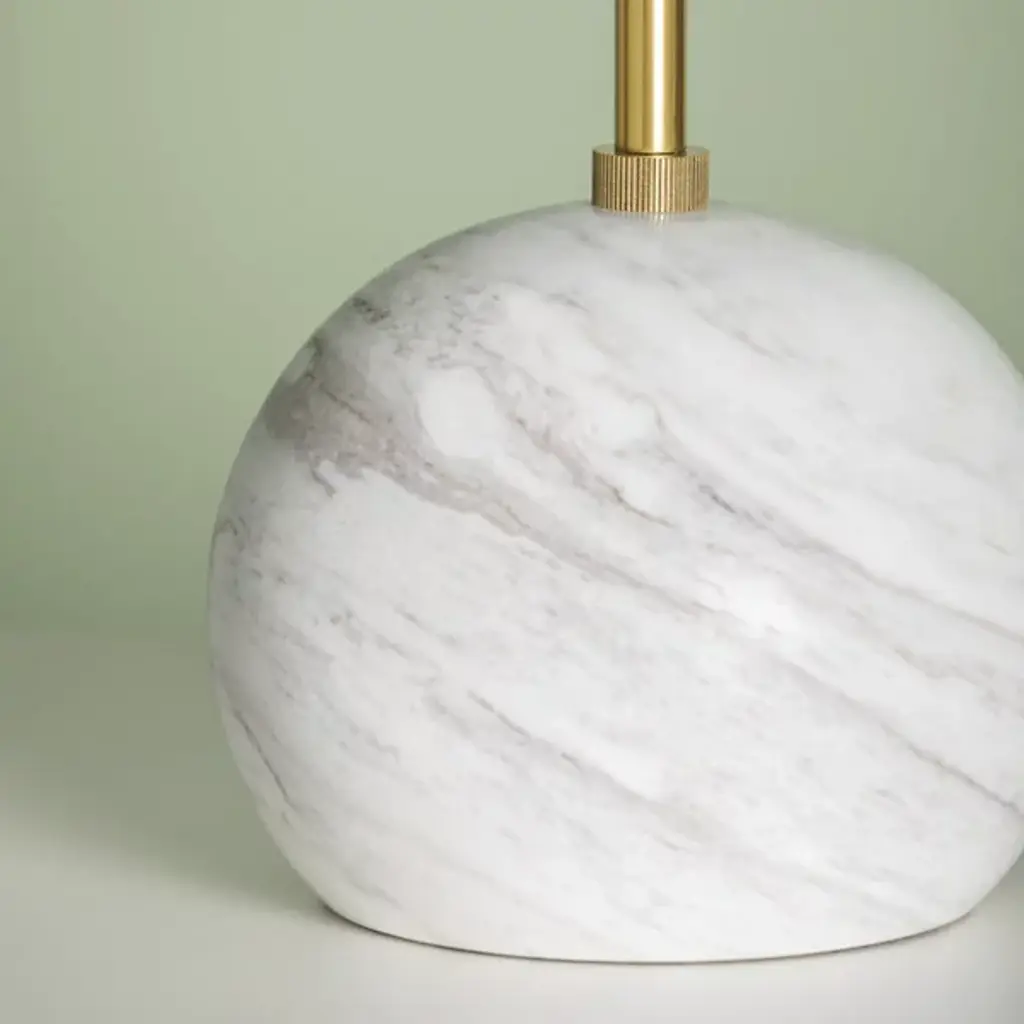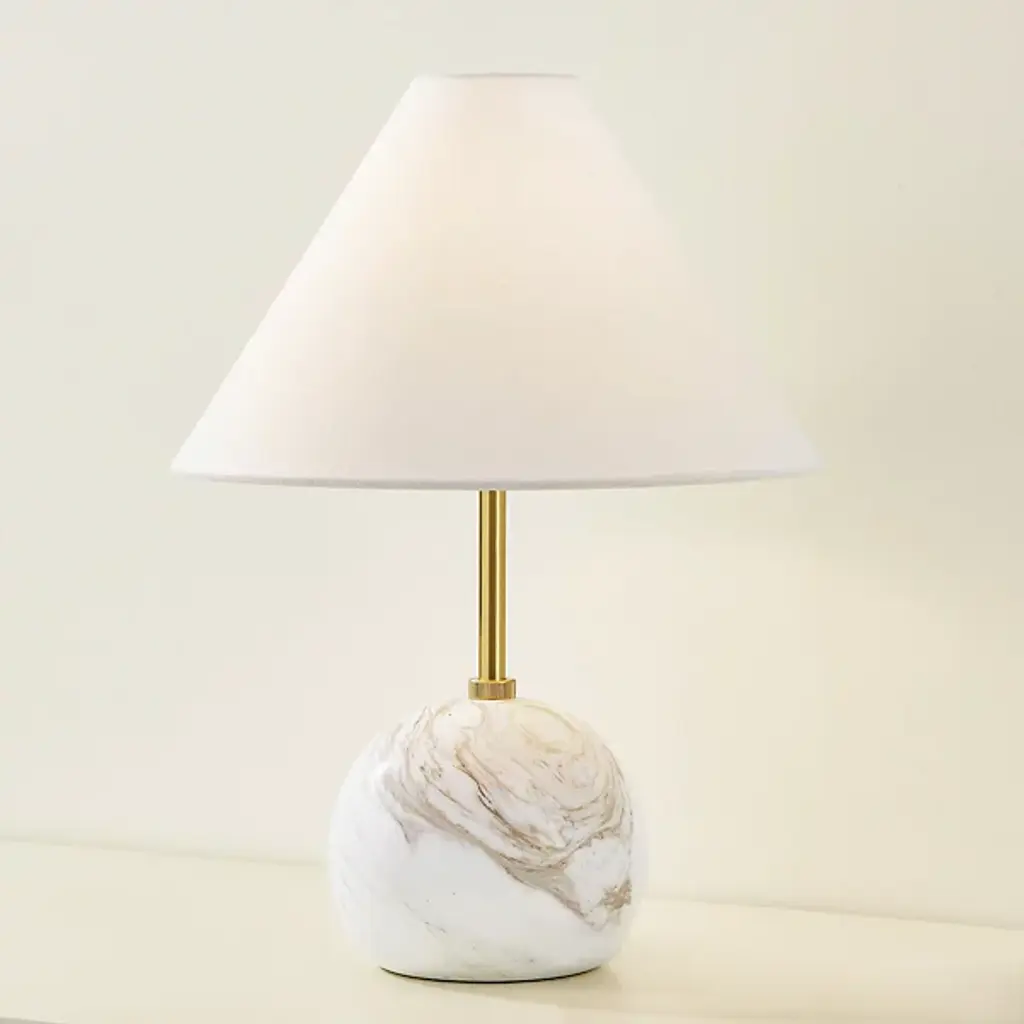 The Jewel Table Lamp from Mitzi stands somewhat small yet remains statuesque, marrying unique materials and geometric forms. Crafted from honed Calcutta gold marble, its spherical body elegantly contrasts with the sleek, elongated steel neck finished in aged brass. Topped with a tapered white linen shade, this lamp adds texture to any room. Due to the distinctive nature of the medium, variations in colors and patterns may occur. Constructed with steel and marble, its vibrant surface is brightened by direct downlight, complementing Transitional-style decor, and making it an exquisite addition to any interior space.