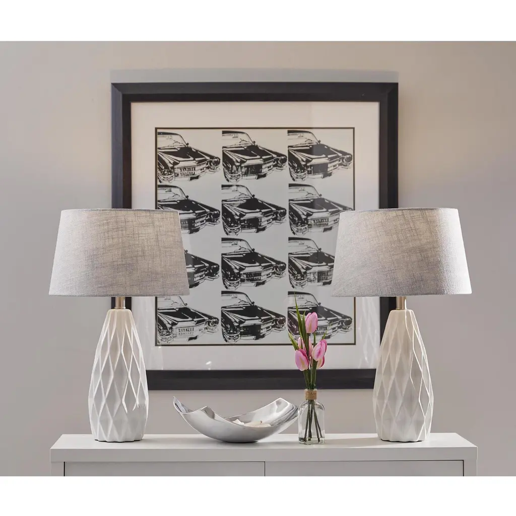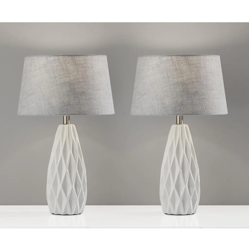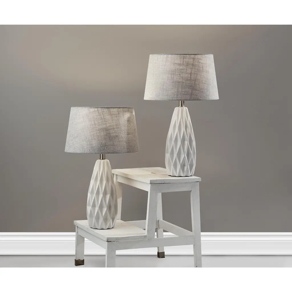 This functional and fashionable set of table lamps will liven up your console table or bedside. The white ceramic base has a unique geometric silhouette while the grey fabric shade reveals its beautiful texture when lit up. Turn the lamps on and off with a convenient switch on the socket. All Adesso lighting product is either UL or ETL listed, meaning that it has been tested and approved to meet the government-regulated safety standards for the USA. Bulb is not included.