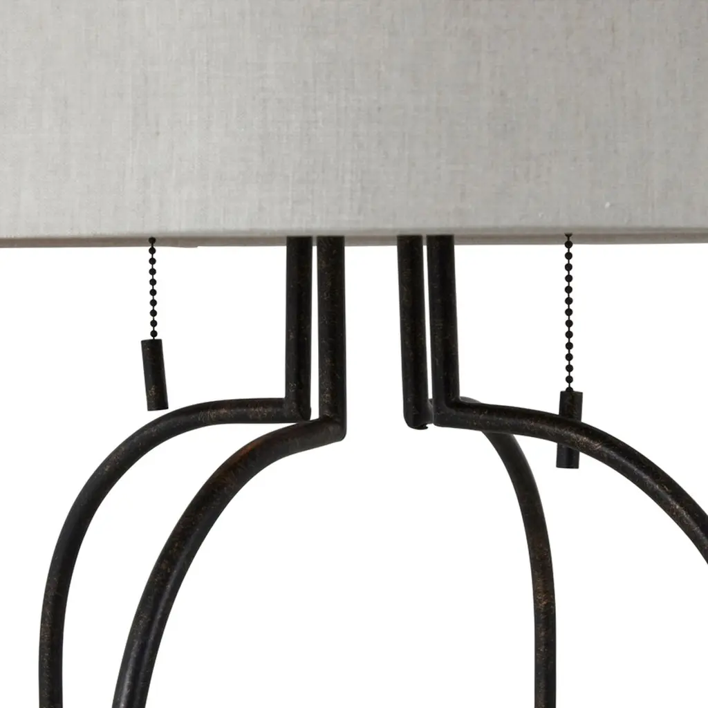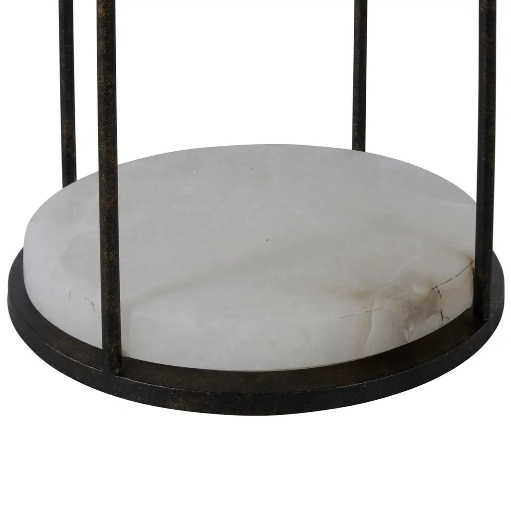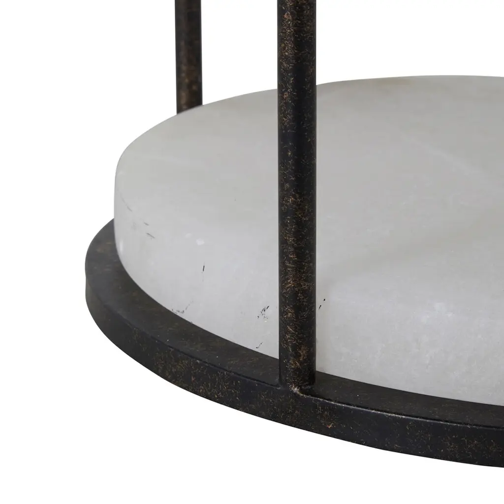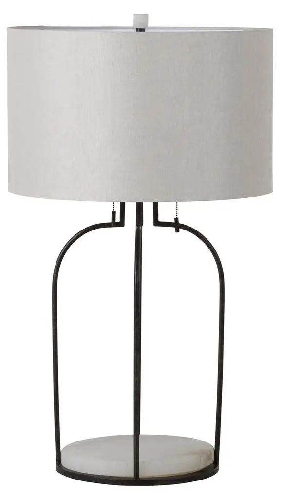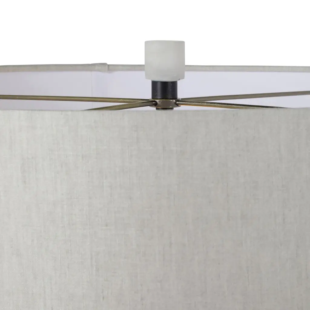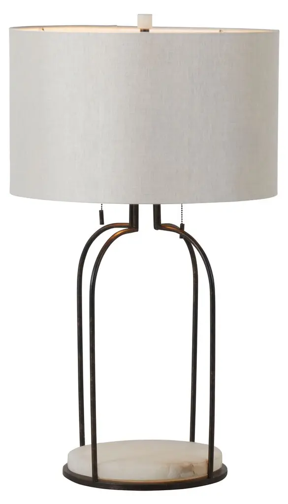 A disk of luminous alabaster anchors the open bronze body of this table lamp, which will complement traditional and contemporary rooms alike. The white linen shade is the perfect finishing touch,