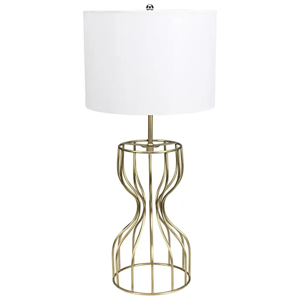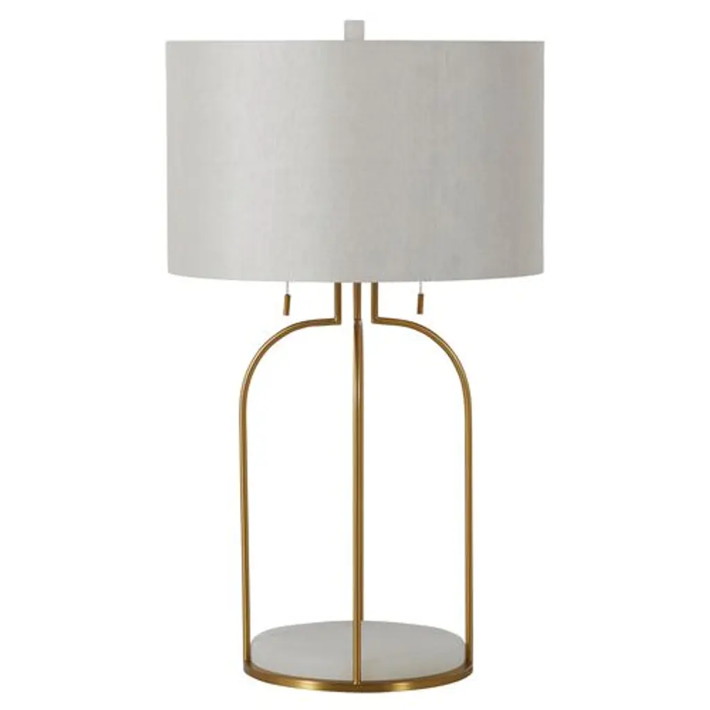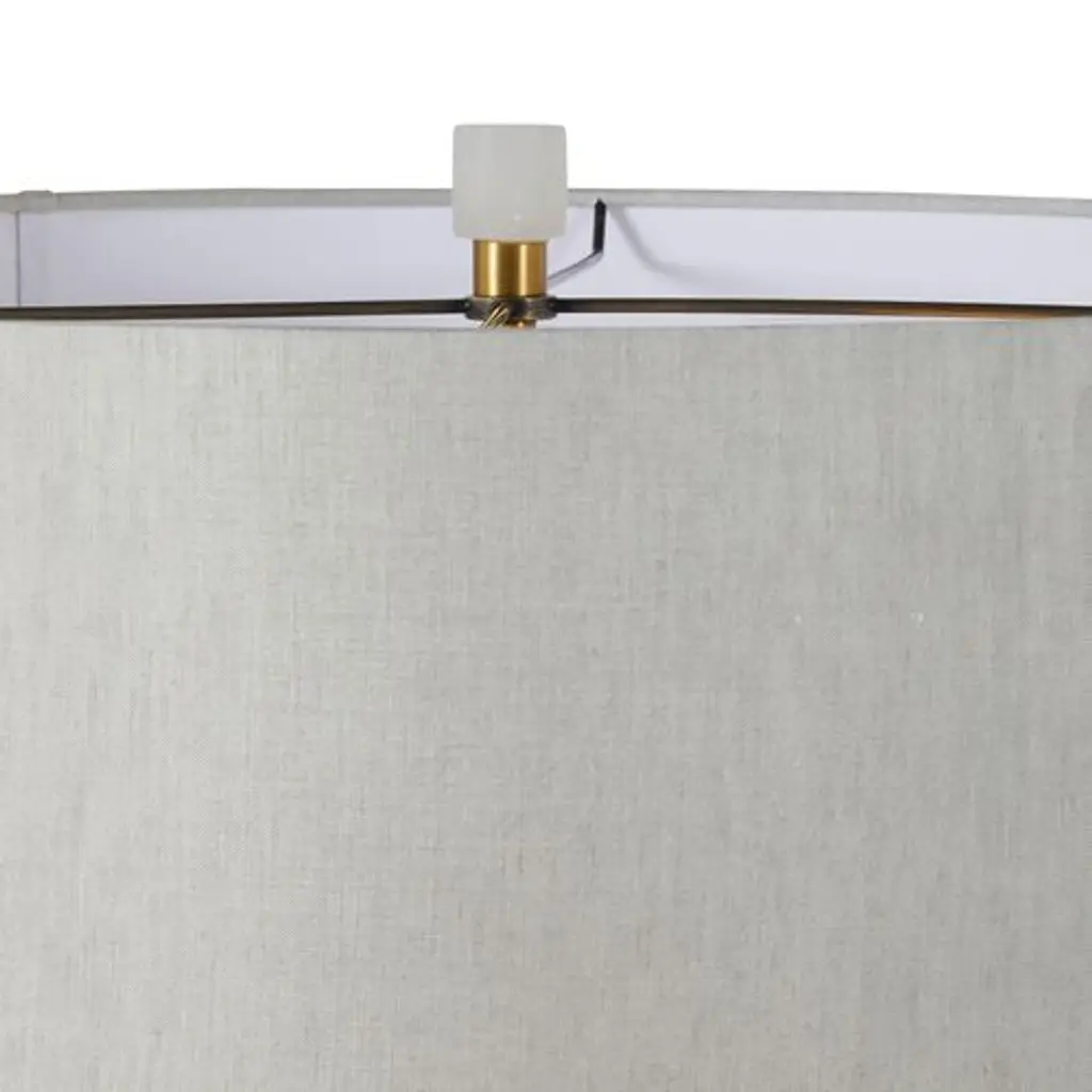 A disk of luminous alabaster anchors the open golden body of this table lamp, which will complement traditional and contemporary rooms alike. The white linen shade is the perfect finishing touch,