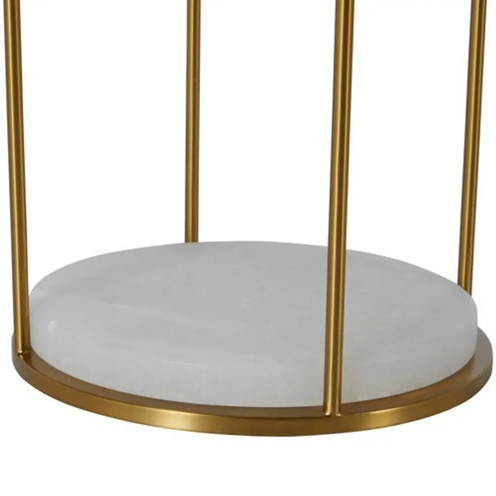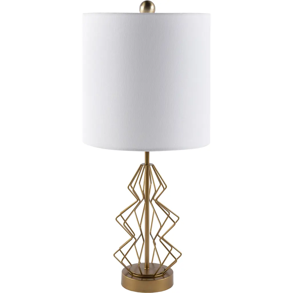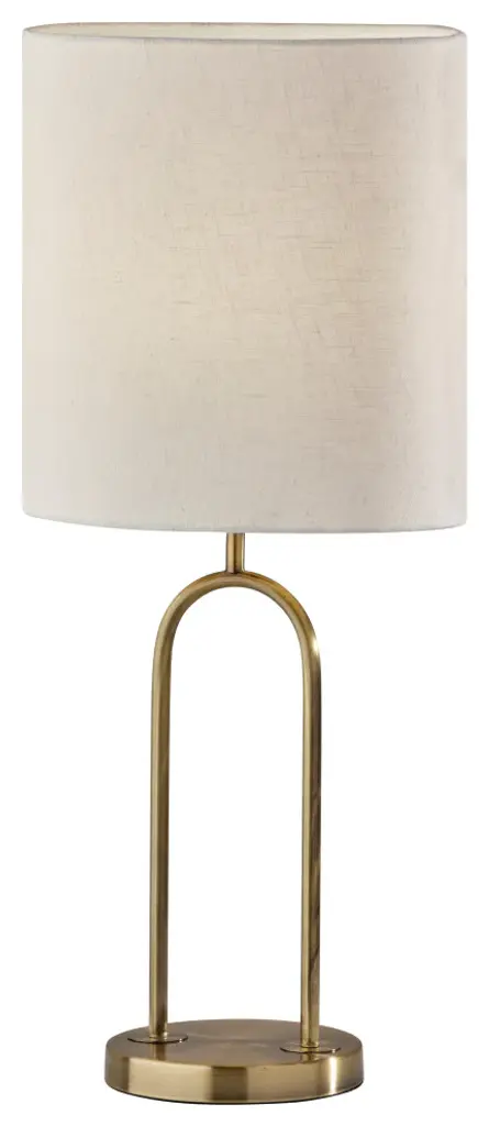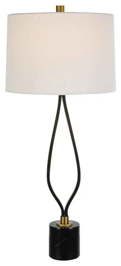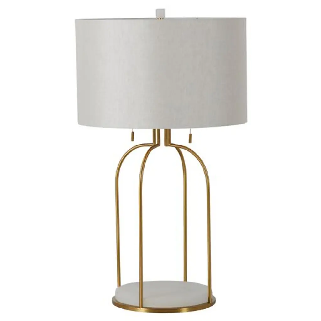 A disk of luminous alabaster anchors the open golden body of this table lamp, which will complement traditional and contemporary rooms alike. The white linen shade is the perfect finishing touch,