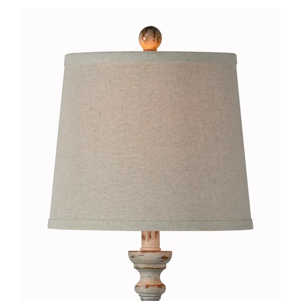 Classic in style, the Jodie buffet lamp features a distressed gray finish and is topped off with a grey linen shade. Each lamp in this set of 2 is made of resin and stands 32 inches high from base to finial. The linen hardback shade measures 9 inches in diameter at the top, 11 inches in diameter at the bottom, and is 9 inches high. Jodie uses a 60 watt medium base bulb (not included).