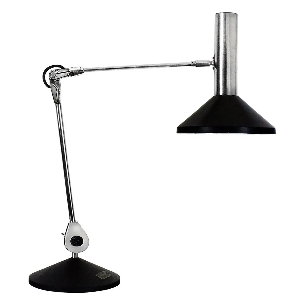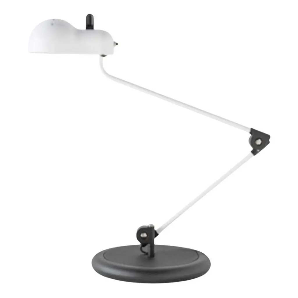 Joe Colombo 'Topo' table lamp in black with base for StilnovoFounded in 1946 in Milan, Stilnovo was one of the most innovative lighting companies in Italy during the Midcentury era, producing iconic pieces by such luminaries as Joe Colombo, Angelo Mangiarotti, Ettore Sottsass, Gaetano Scolari, Piero Castiglioni, Bruno Gatta and others. Stilnovo was relaunched in 2019 with a commitment to faithfully re-edition its legendary designs with uncompromising attention to detail, materials and craftsmanship.The 'Topo' table lamp, originally designed by Joe Columbo in 1970, has long been recognized as an iconic and timeless design. The reflector's shape mirrors that of a standard light bulb while sitting atop an adjustable arm. Reminiscent of the vents on a 1960's sports car, five slots were created atop the reflector to dissipate heat from original incandescent bulbs while preventing direct glare. A black handle permits the user to adjust the reflector to a variety of angles making this light ideal for any task, as does the jointed arm. A staple of Italian lighting design, this version is meticulously executed to Stilnovo's exacting standards in powder-coated aluminum.Price per item. Available to order in unlimited quantities. Choice of colors include green, white, black, red or chrome. Also available as a mini table lamp, or floor lamp. This table lamp is available with a round base or clamp base. Please see our separate listings for variations. This listing is for the 'Topo' table lamp in black with round base for Stilnovo.In stock lead time 6-8 weeks. Out of stock can add an additional 8 weeks or more. Please note that lead times and inventory availability are subject to change without notice. For time sensitive orders, please contact us for current lead times prior to purchasing.Shipping cost quoted is per item and cannot be combined.Illuminated via standard medium base E26 bulb, 7 watt LED recommended (bulb not included). Powered by black cord with 8.2' length. IP20 rated. This lamp is UL listed.Made to order.All sales are final.
