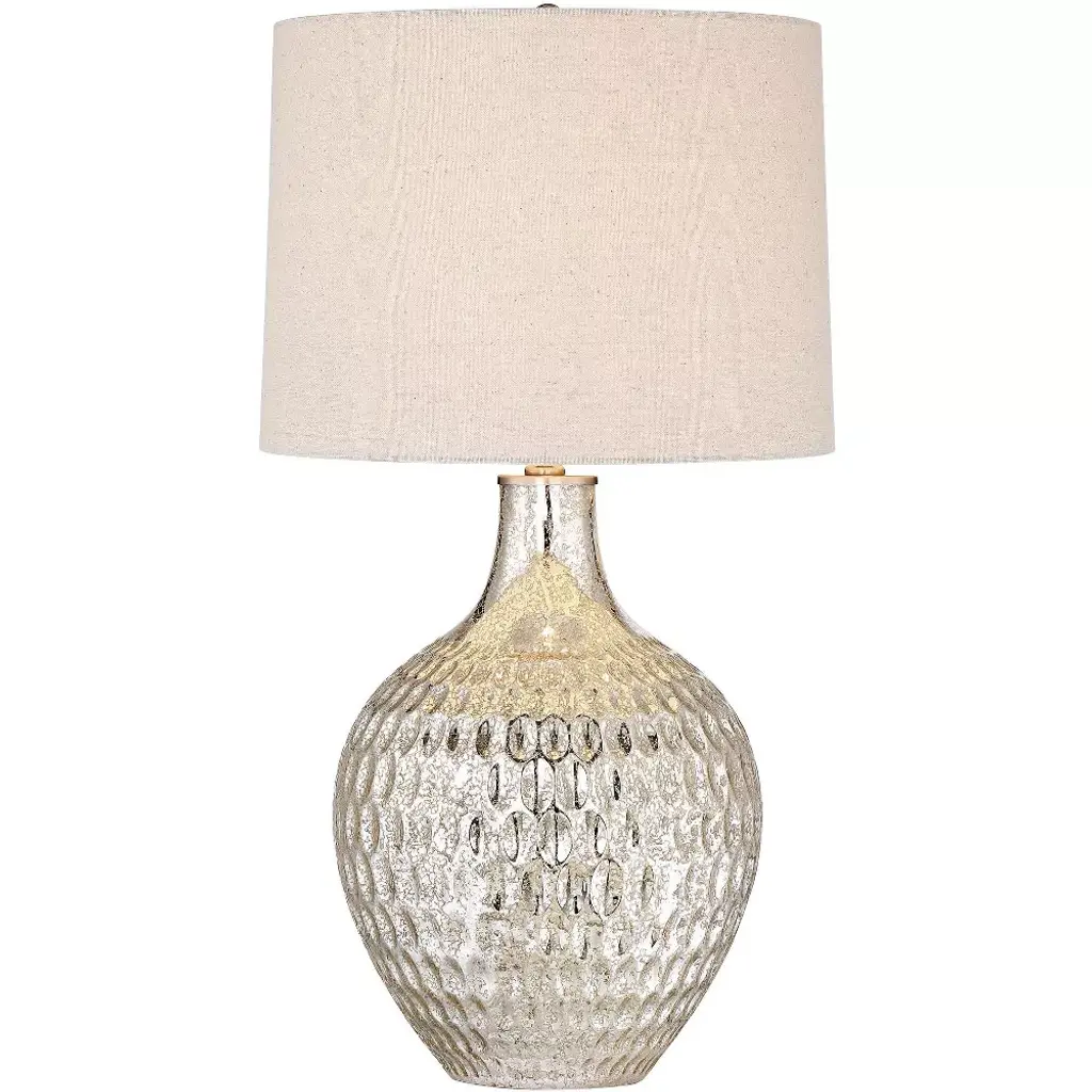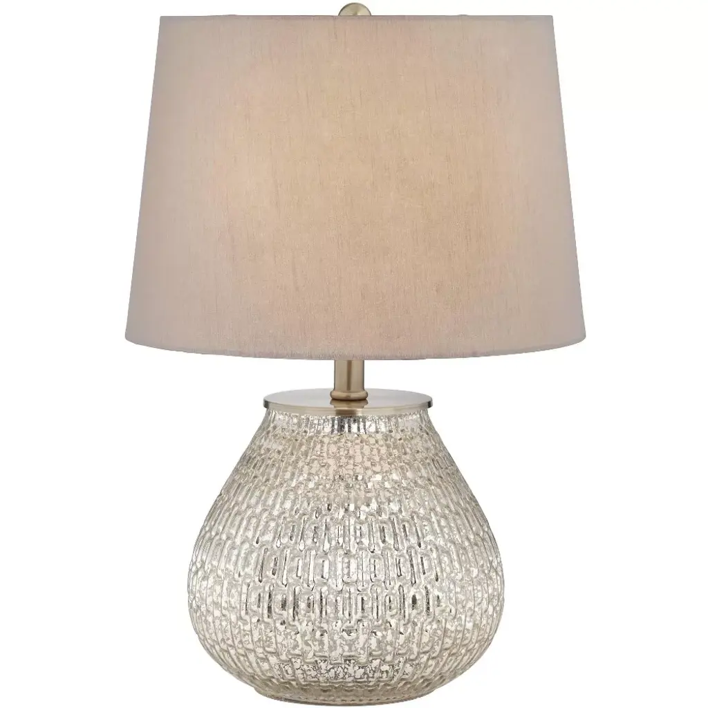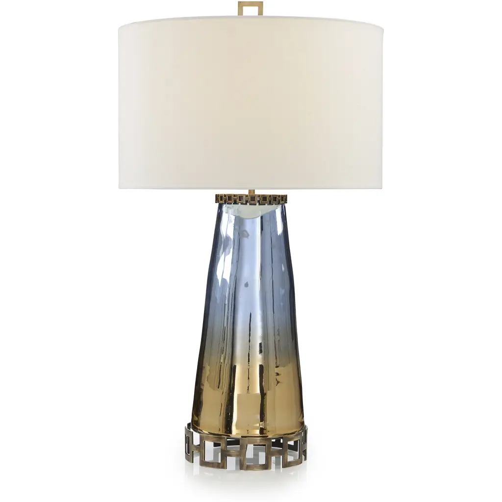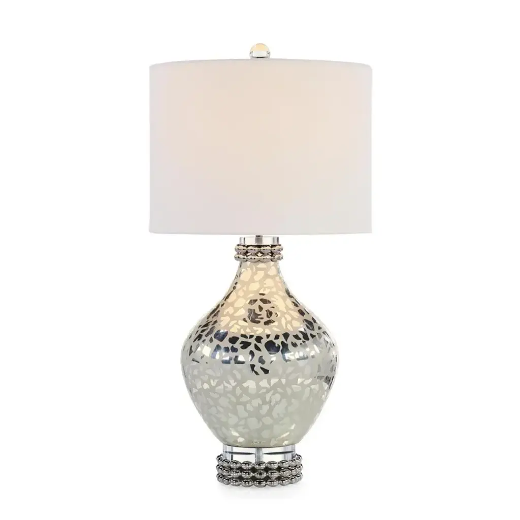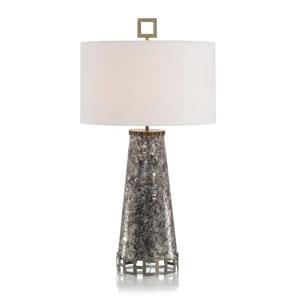 The Johanna Table Lamp is a naturally inspired design statement elevated through chic contemporary charm. This brass lamp with a cylindrical shape showcases a stunning crocodile skin texture in a Nickel Brass finish. The neck and base showcase a stylish arrangement of Polished Brass spheres, infusing the piece with visual depth. The piece sits atop a round base of clear acrylic and features a matching egg finial. The look is completed by a drum shade in a pristine white tone.