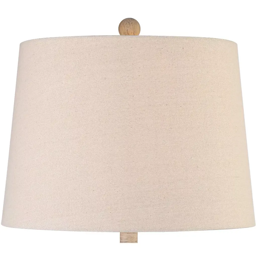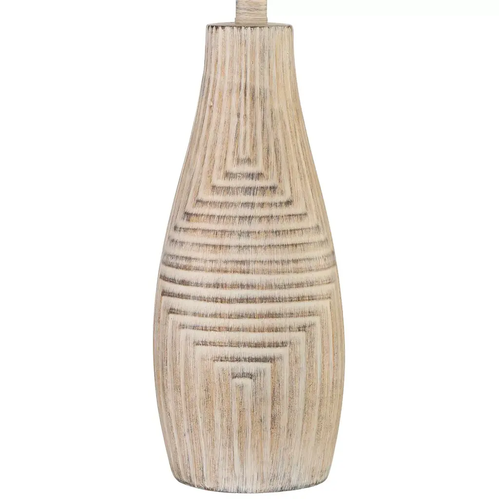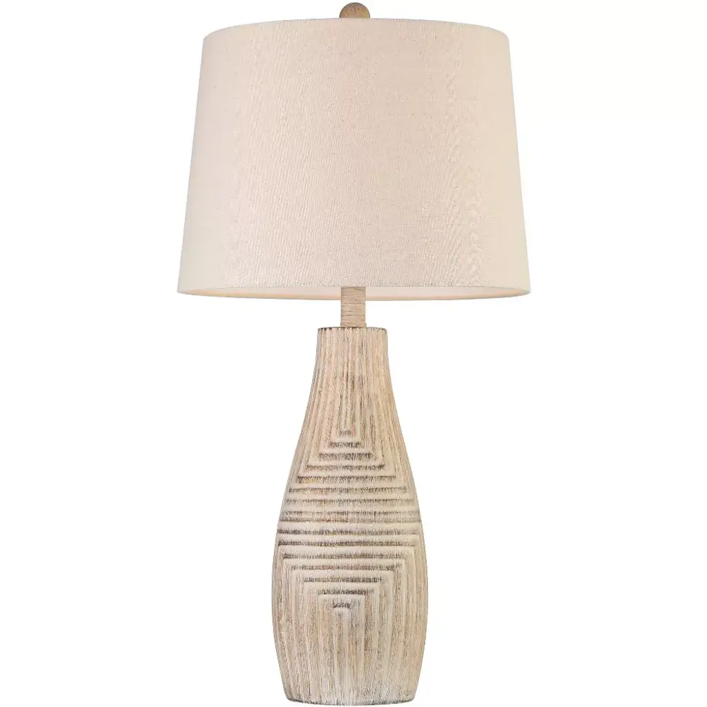 From John Timberland lighting, this rustic table lamp adds a rugged desert flavor to any setting. It features a worn faux wood finish in light, sandy color tones, with a faint geometric pattern imprinted onto the curving silhouette. An oatmeal drum shade on top provides an earthy finish touch. Turn the light on and off with a switch located on the socket.