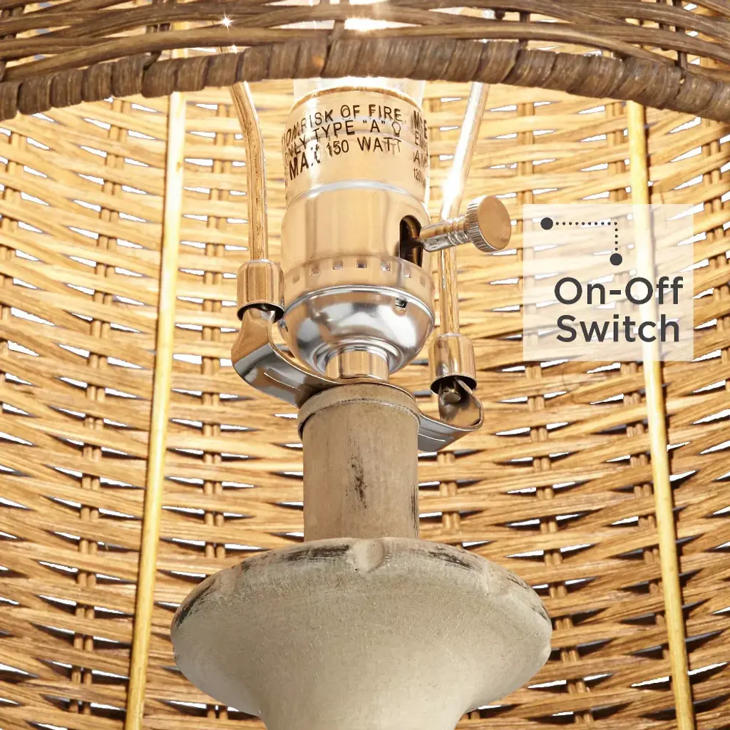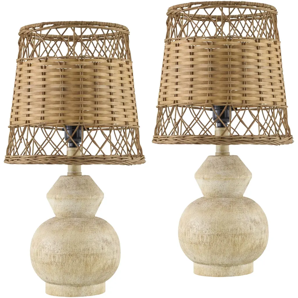 Mixing two distinct styles, these table lamps offer a delightful design that brims with cottage and island inspiration. In a convenient set of two, each lamp comes in a candlestick frame with an antique beige finish that gives it a worn and weary look. Rattan drum shades on top add an organic touch that draws the eye. The result is a set of rustic coastal table lamps that adds decorative charm to your living space.