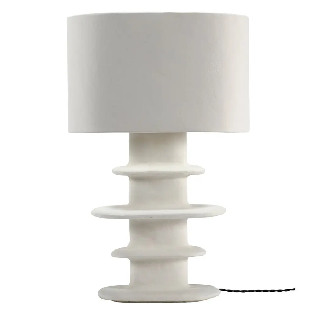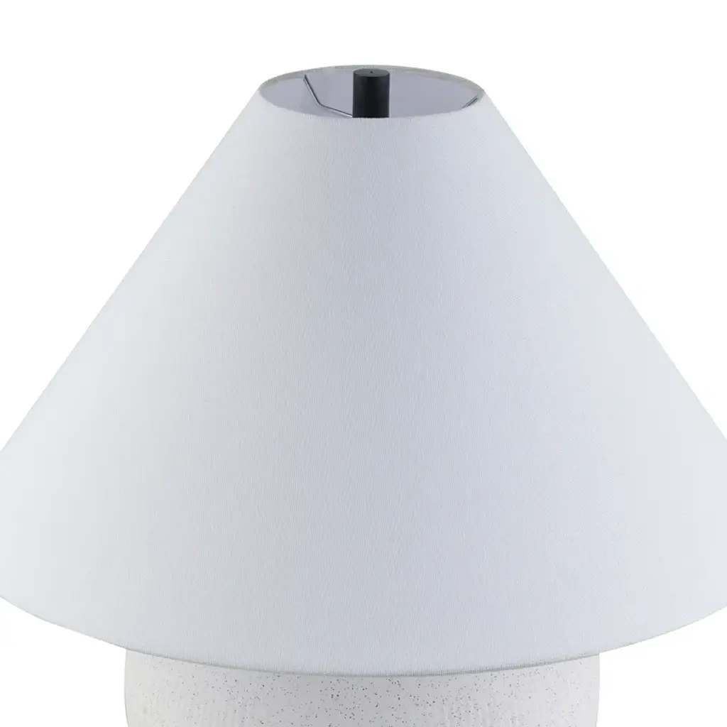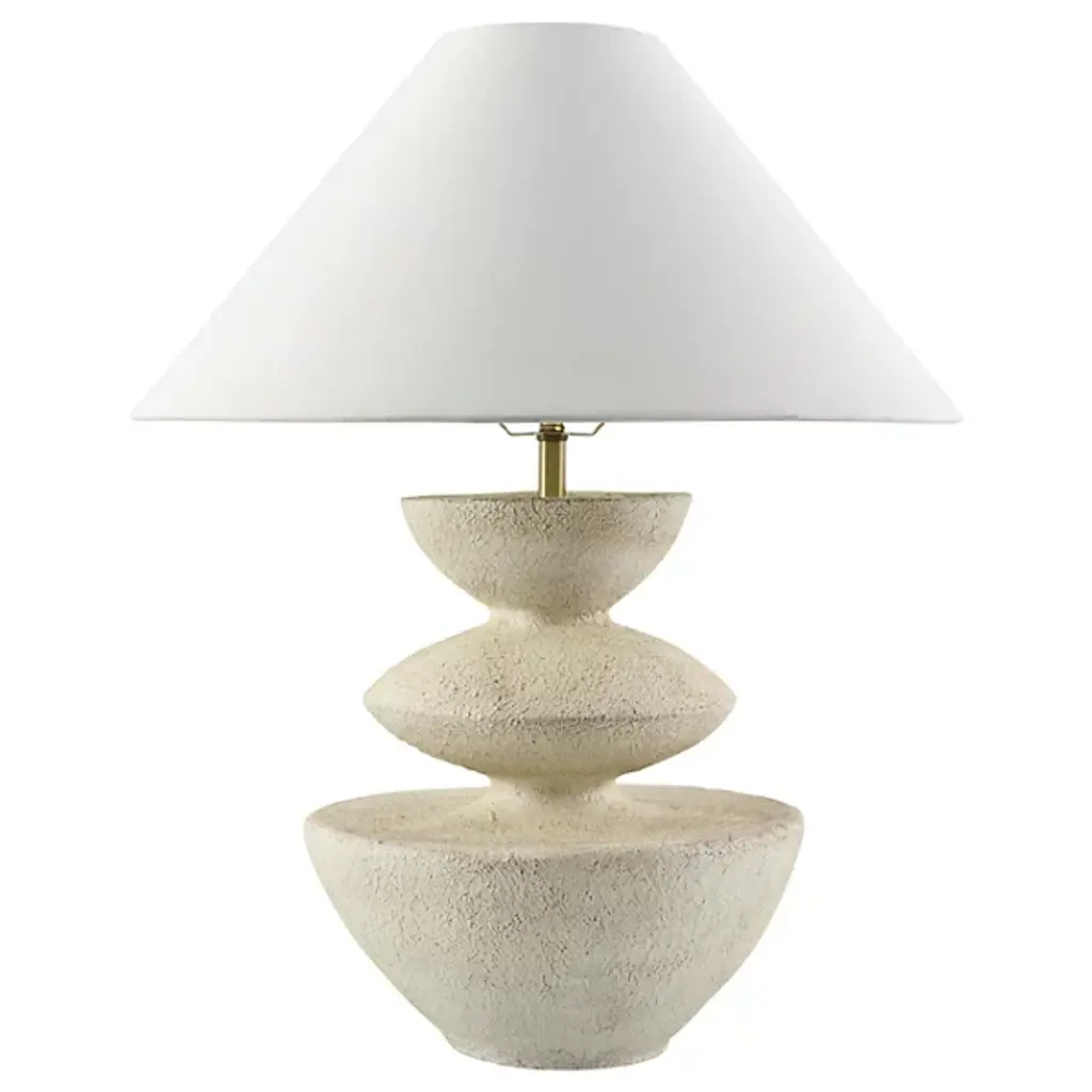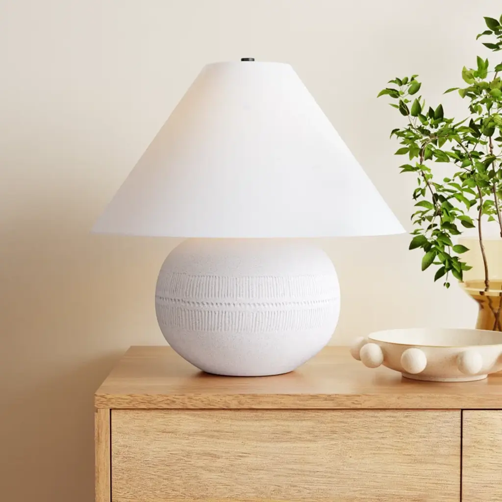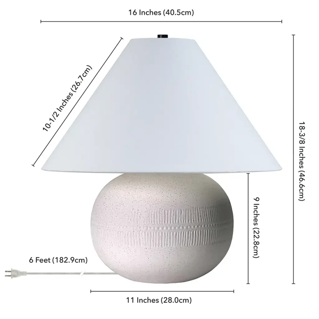 The neutral, organic tone and stamped detailing of this table lamp create a rustic yet modern look. The rounded jug-shaped ceramic base is a natural cream color with a lightly textured surface. The hand-stamped designs encircling the widest part of the fixture add visual depth. On top is a white fabric cone shade, a crisp finishing touch that keeps the design looking fresh and contemporary.