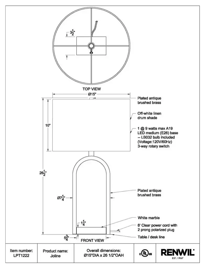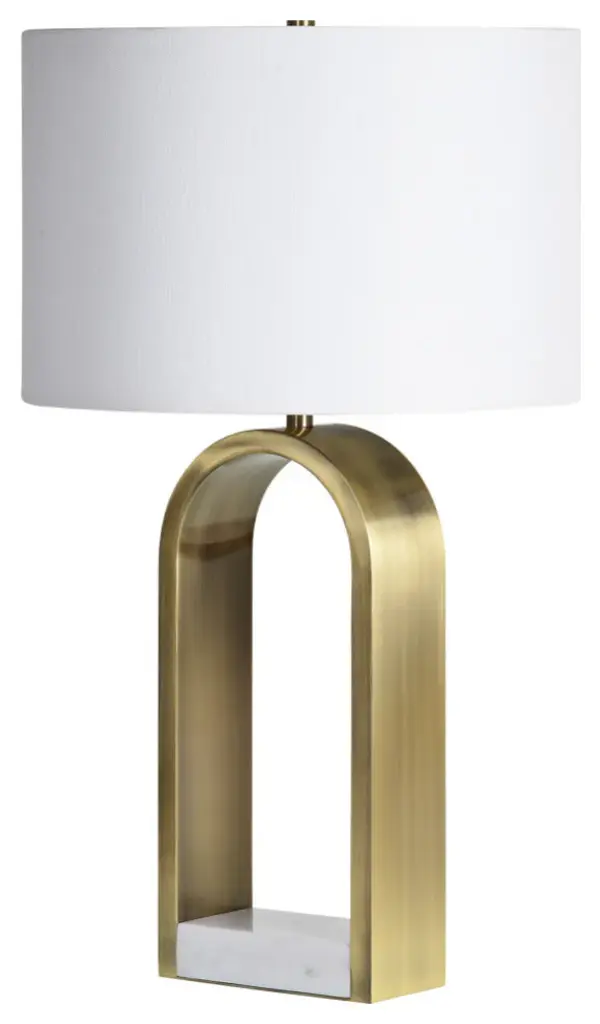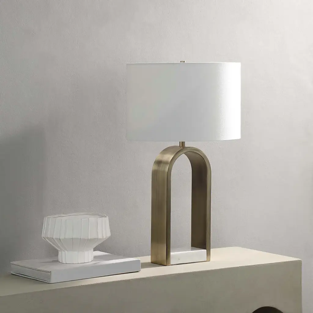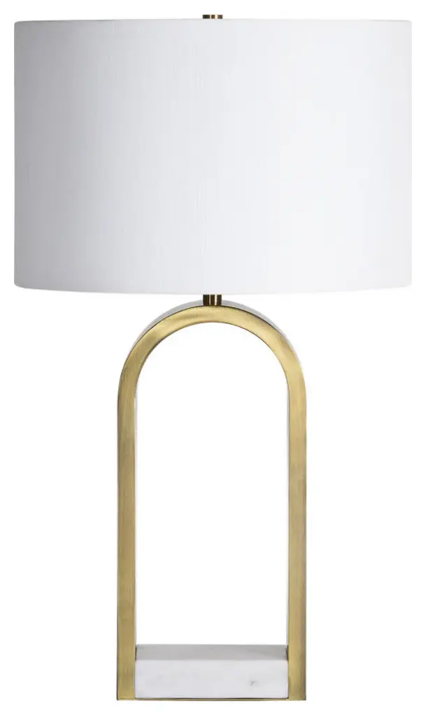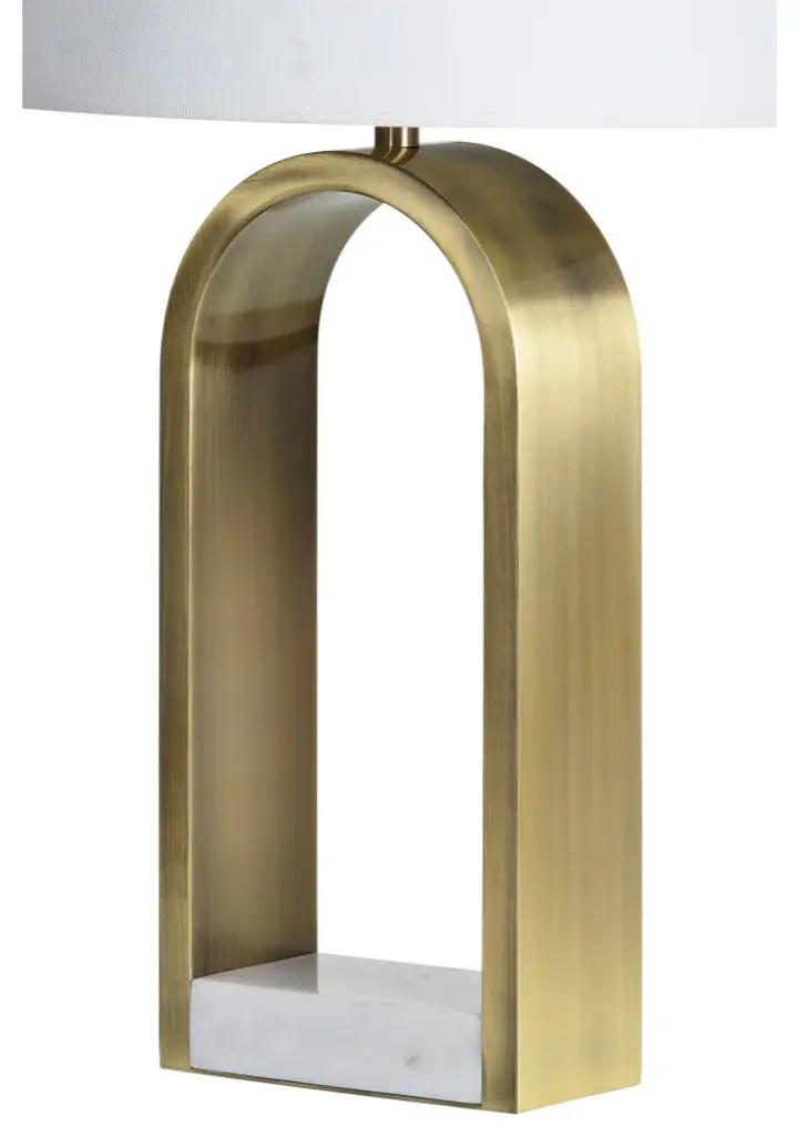 Radiant even when unlit, this table table lamp exudes a transfixing beauty upon all elements in its midst. Composed of marble and antique brushed brass plated iron, this table lamp has an architecturally inspired structure that brings dimension diversity into the living room. Set on a living room side table, this piece pairs well with strong furnishings in neutral or vivid hues.
