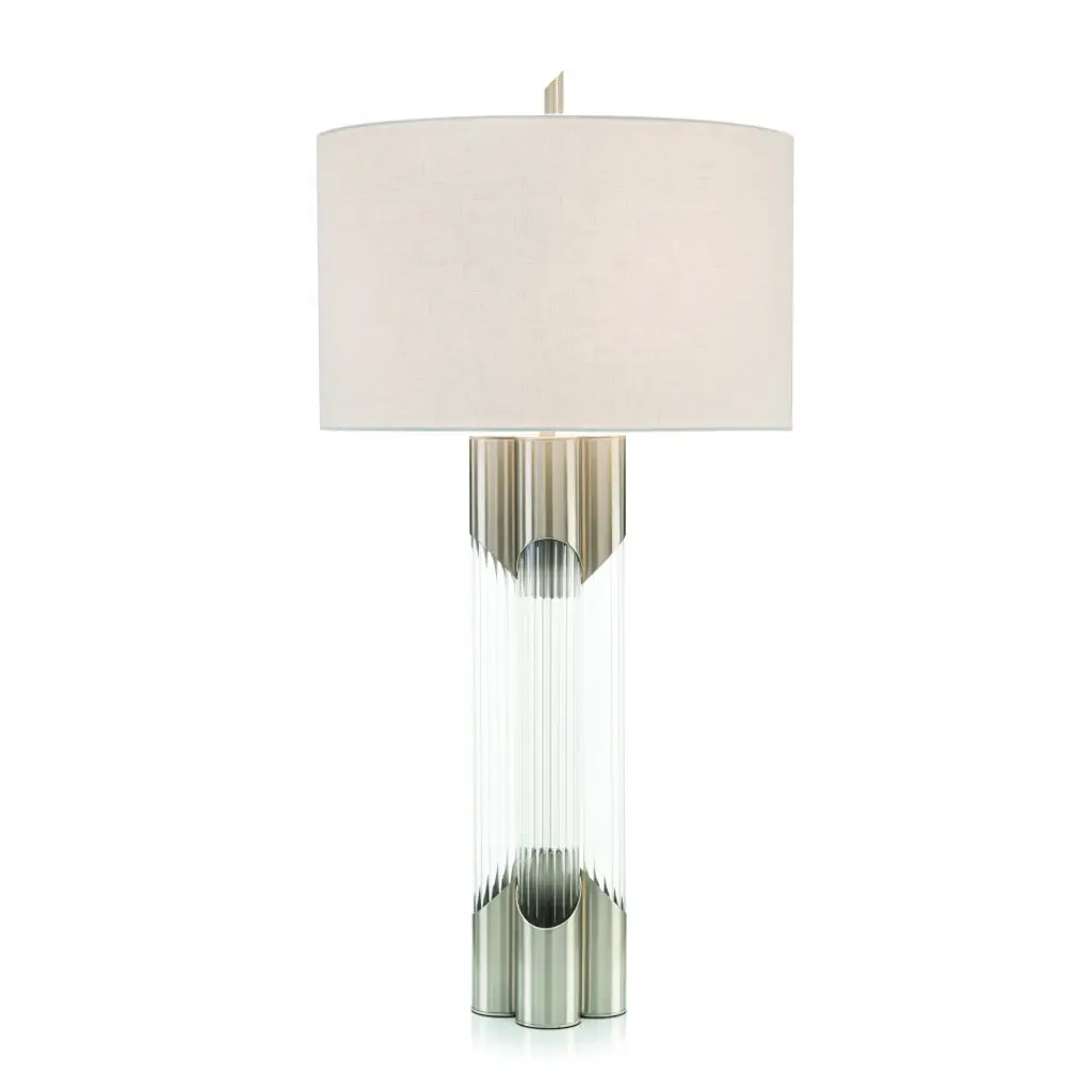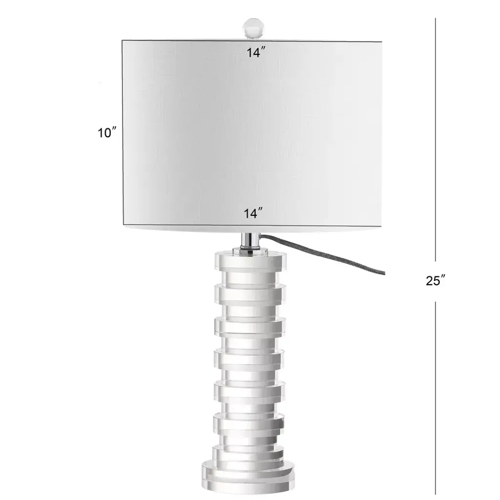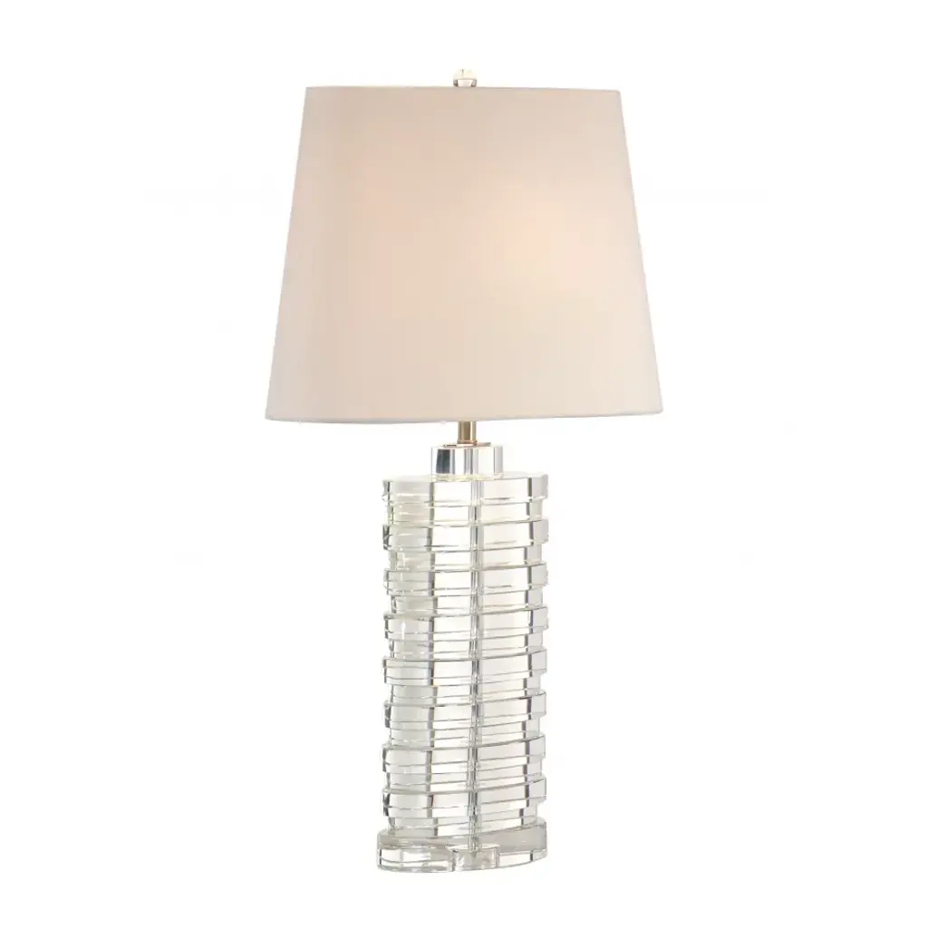 Staggered crystals in a geometric column base add modern elegance when illuminated beneath a classic linen drum shade. This crystal table lamp with chrome electrical fittings and a silk-wrapped cord is pretty enough to be the focal point of your room, but versatile enough to go anywhere. Standing at 25" tall, it's perfect proportions make it well suited to illuminate bedsides, console tables, or reading nooks.