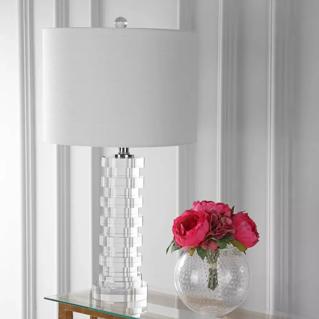 Jonathan Y 25" Crystal Sasha Table Lamp (Includes Led Light Bulb) Clear :Linen Drum Shade, Chrome Fittings