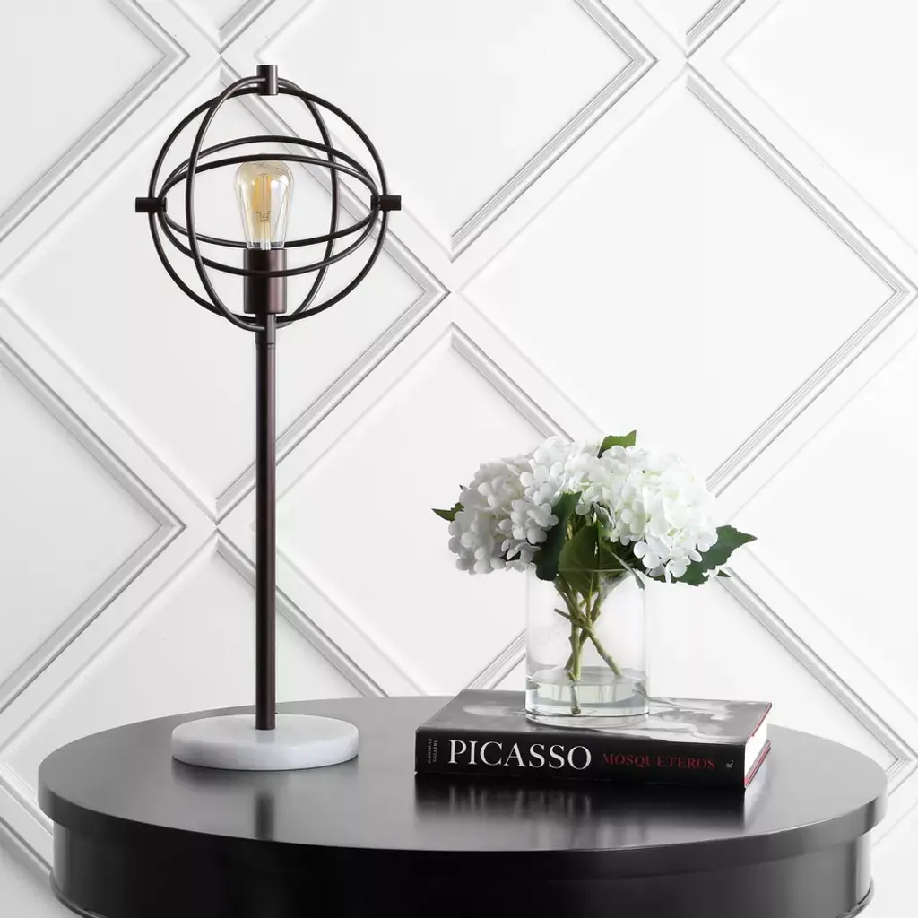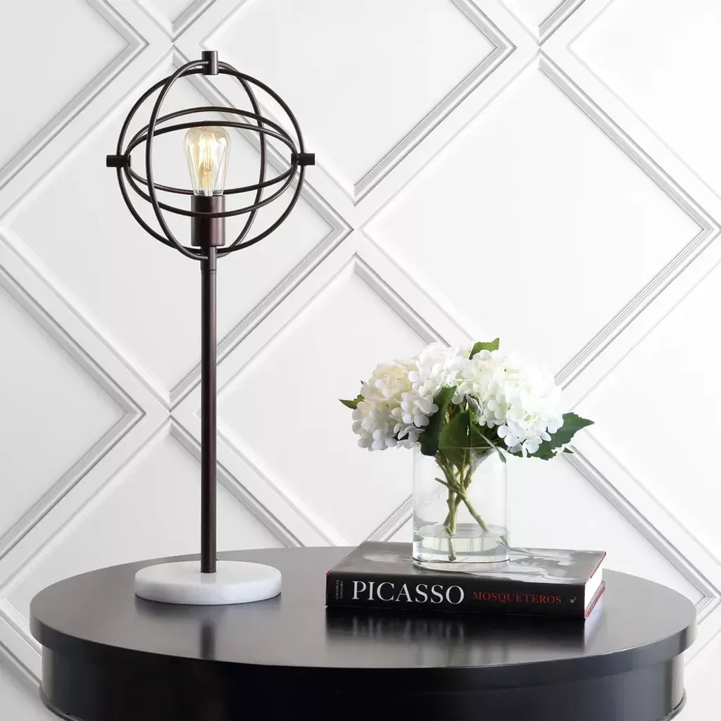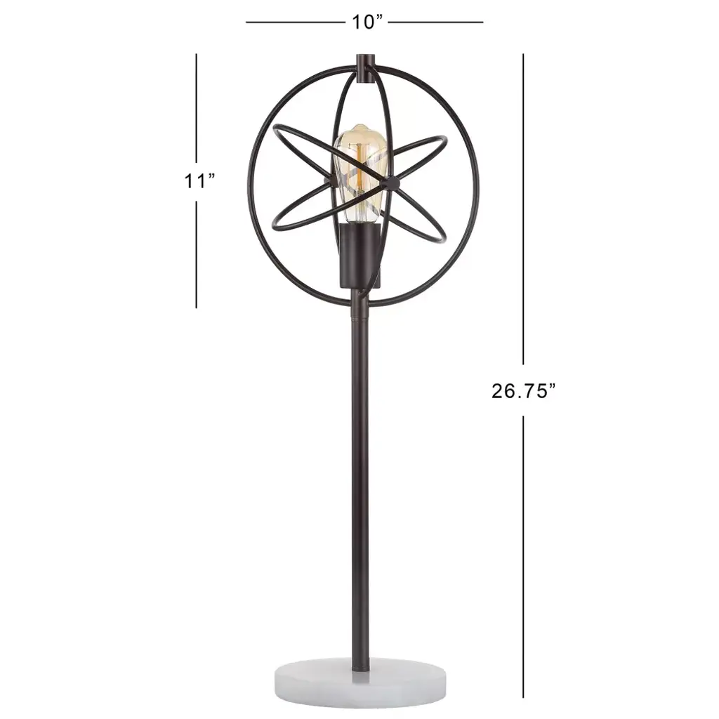 With its caged design and Edison-style bulb, this unique lamp adds an industrial touch. The bronze metal loops orbiting the bulb have a Space Age aesthetic, while the marble base is a sleek detail. This lamp is the perfect accent piece for mid-century modern or industrial style decor. Edison-style LED bulb saves energy; convenient in-line switch. Quality oil-rubbed bronze finish and silk-wrapped cord. On-off in-line switch. Eco-friendly 4W LED bulb included. Takes one bulb and compatible with any 9W LED or 60W TYPE A or 13W CFL. UL Listed. Before cleaning any lamp shade or fixture, disconnect the power source. Wipe with a soft, dry cloth. Avoid the use of chemicals and household cleaners as they may damage the finish.