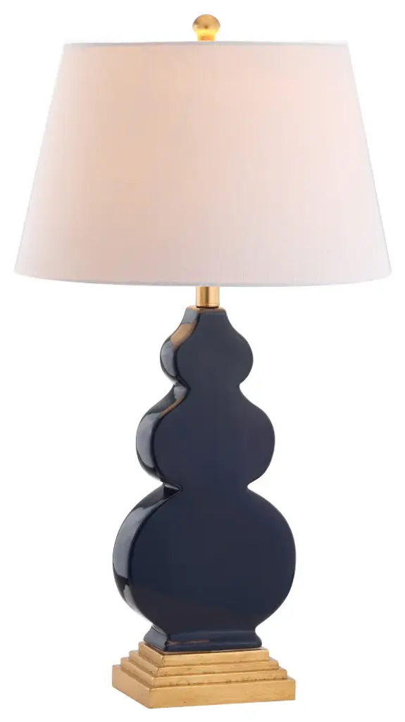This beautiful tapered triple gourd base ceramic table lamp will brighten up your home with the elegance of contemporary style. Modernized from the midcentury classic by a revised shape that is flat on two sides but retains the classic curves of the original, the look is completed by a gold leaf stepped pedestal base. Finished in a glossy navy blue glaze, it is topped with a slightly tapered cotton linen drum shade and gold finial.