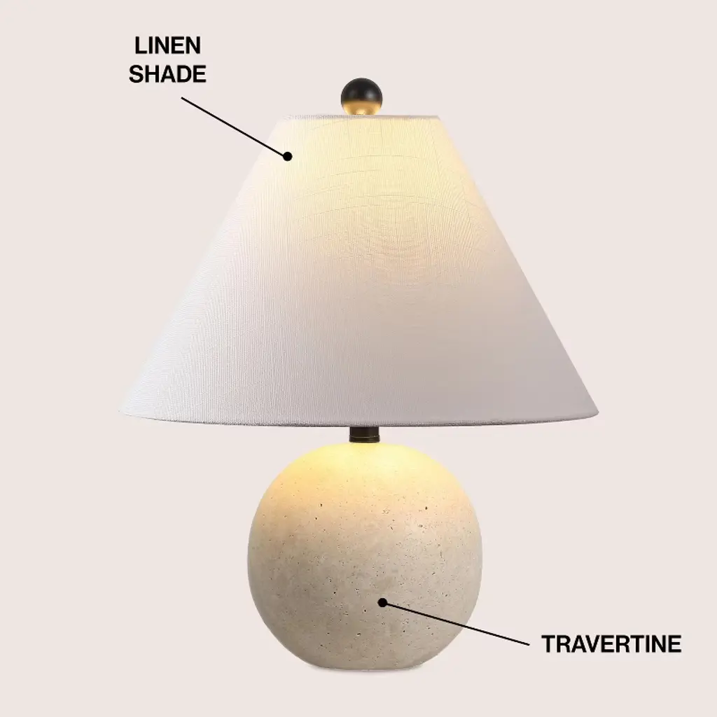 A modern take on mid-century lamps, this minimalist design features a real travertine stone base and hardbacked linen shade. Its timeless geometric style is perfect for a modern bedroom, living room, or entry. Includes an LED bulb for warm, bright light.