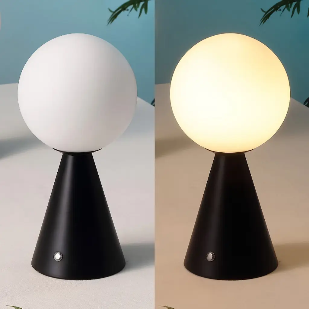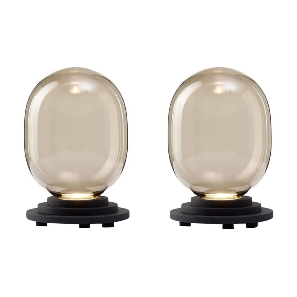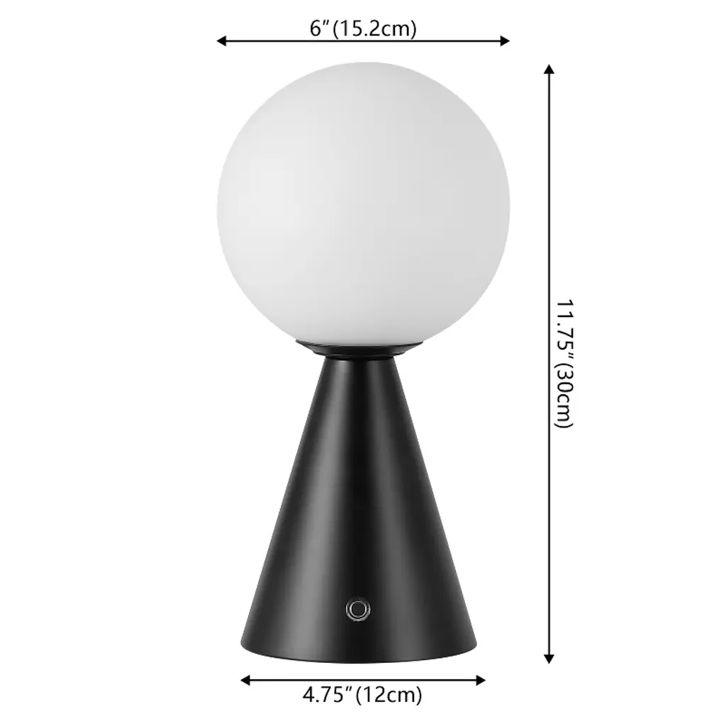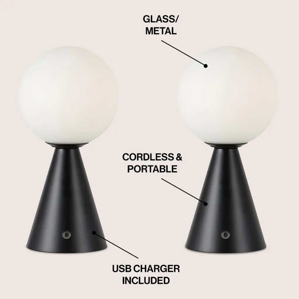 This pair of modern, minimalist lamps adds a warm glow to the bedroom, living room or office. The durable metal base is topped with a glass globe and features a bright LED bulb controlled by a touch sensor. Use this set of two cordless lamps almost anywhere with the rechargeable battery.