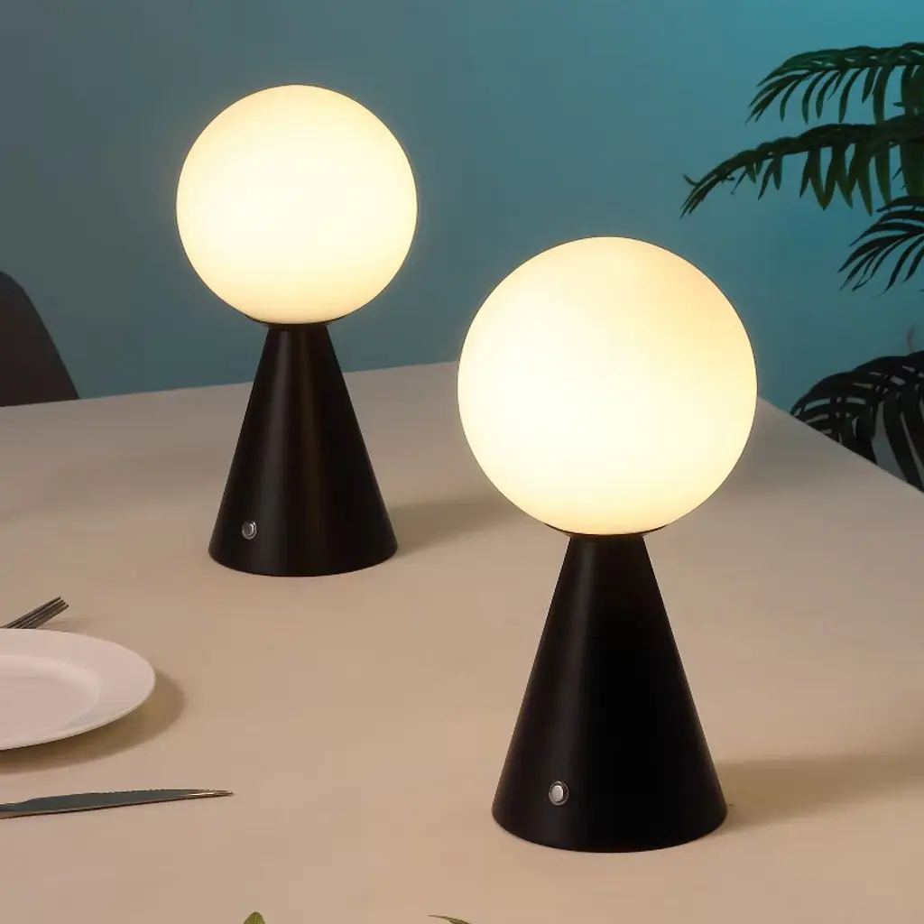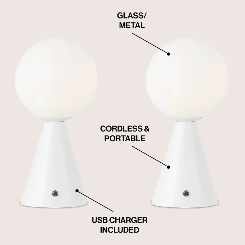 This pair of modern, minimalist lamps adds a warm glow to the bedroom, living room or office. The durable metal base is topped with a glass globe and features a bright LED bulb controlled by a touch sensor. Use this set of two cordless lamps almost anywhere with the rechargeable battery.