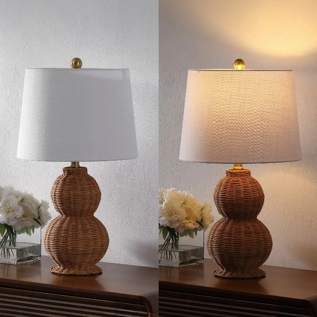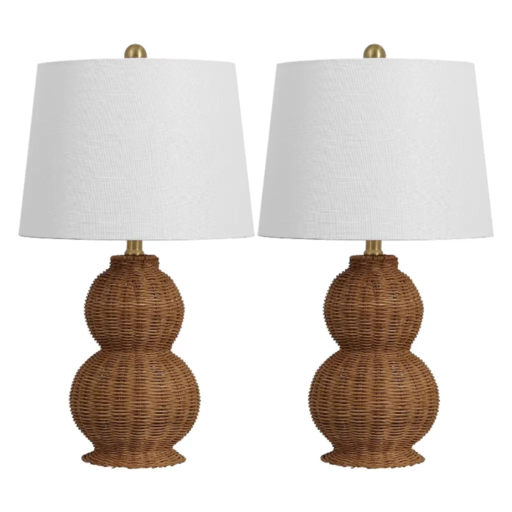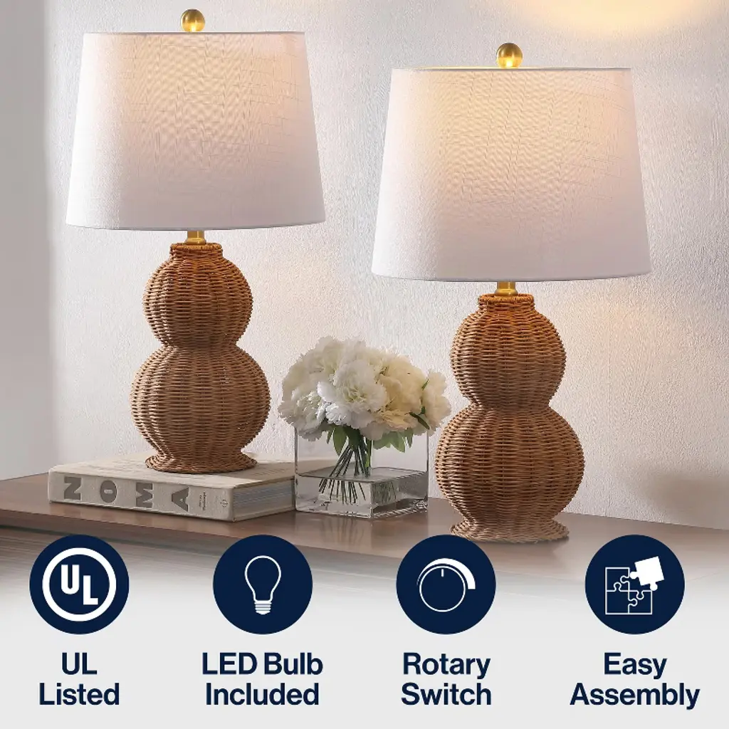 Modern style meets a coastal classic with this versatile pair of lamps. Each lamp features a rattan base in a classic gourd shape, topped by a hardbacked linen shade. With their warm, bright LED bulbs, this timeless pair adds a cozy glow to the living room, bedroom or home office.