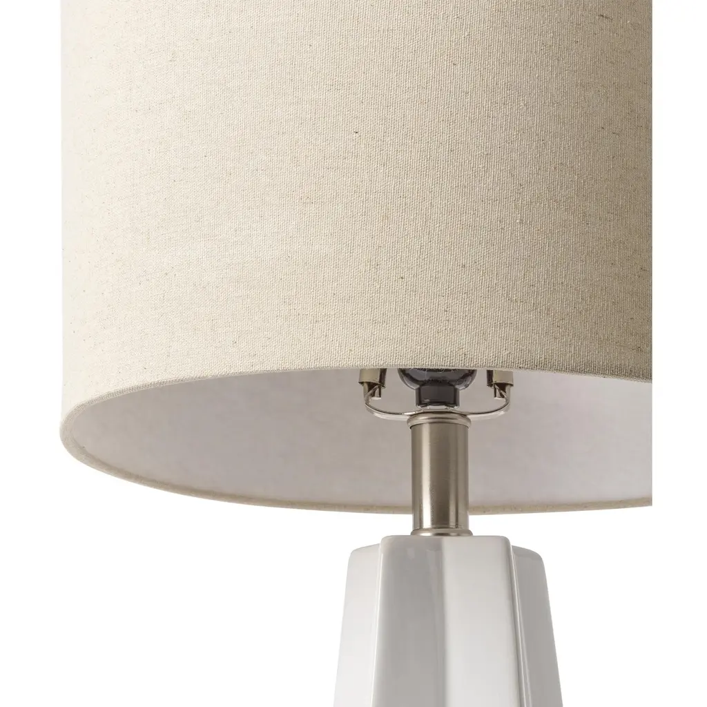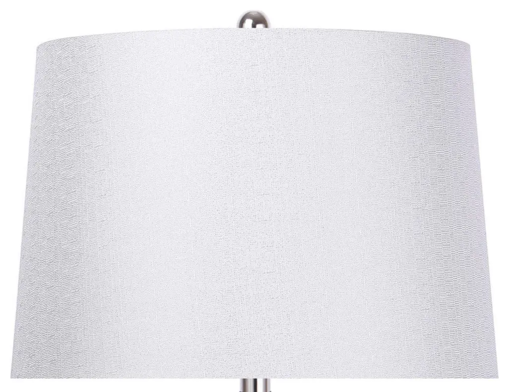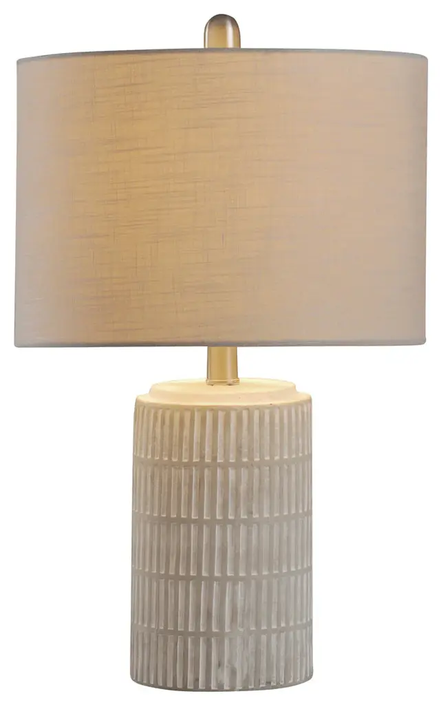 Joni Ceramic Table Lamp - Distressed Gray/White Finish - Heathered Light Gray Drum ShadeWhether you want it in the living room or study, the Joni table lamp is a versatile way to bring light into a room. It is made of ceramic, so you can be certain it is not going anywhere, and features a gray and white distressed finish. Brilliant illumination shines through the round, hardback shade, so you can bring warmth into any room of your house.Features: All hardware and metal turn knob in brush nickel finishA handpainted finish means each piece is unique, with possible slight variations. No two lamps are exactly alike.Composed Of Ceramic Finished In A Gray and White Matte Finish With A Grid Like Embossment All Over.Collection: JoniFinish: Distressed Gray, WhiteShade Finish: Light Gray w, BeigeMaterial: Ceramic, Polyester BlendMaterial Percentage: 75% Ceramic, 25% Polyester BlendShade Material: Polyester BlendShade Length: 13 inchesShade Width: 13 inchesCord Length: 62"Shade Color: Heathered Light GreyVoltage: 120VWattage: 60Lamp Base Dimensions: Body: 9.5"H x 5.5" DiaSafety Rating: Dry Location - This item is rated for dry locations, meaning it can be used in an indoor area that is not normally subject to dampness. May include a location subject to temporary dampness provided ventilation is adequate to prevent any accumulation of moisture such as the bathroomBulb(s) Included: NoBulb Type: Replaceable LEDNumber of Bulbs: 1Marine Grade: NoTitle 20: YesComposite Wood Certification Carb 93120: NoComposite Wood Certification TSCA: NoRequired Assembly: Partial AssemblySpecial Order or MTO: NoDue to lighting and monitor differences, actual colors and finishes may vary slightly from what appears online.