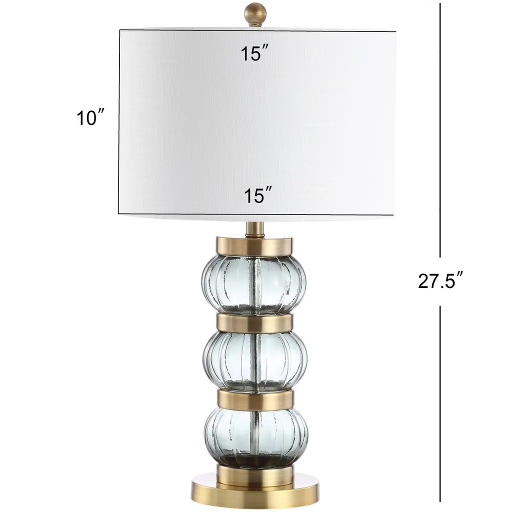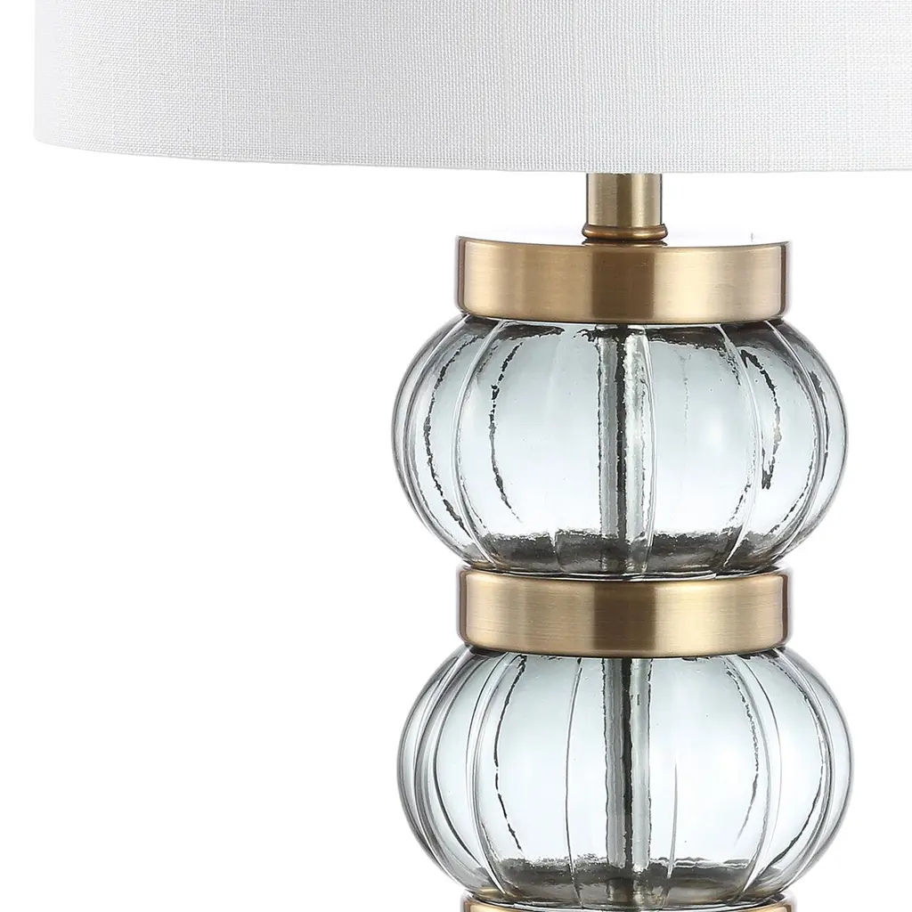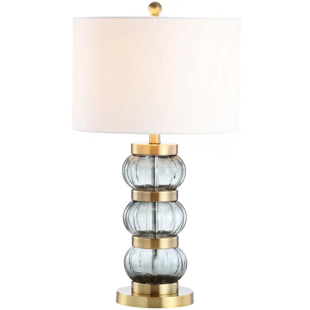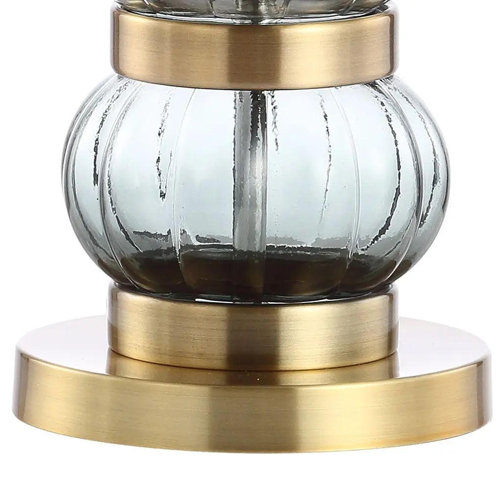 A trio of fluted smoked glass spheres, separated by gleaming brass disks, make up the body of this eye-catching table lamp. The linen shade and the silk-wrapped cord are suitably elegant finishing touches.