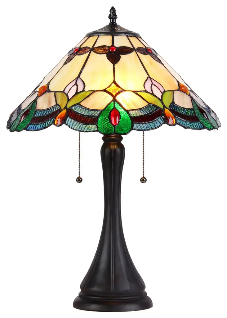 This Tiffany style Victorian design 2-light table lamp features a dark bronze finish. Hand crafted from over 155 individually hand cut pieces of art glass that will add color and beauty to any room. (2) 100 Watt max E26 Type A Bulb (not included)Pull chain156pcs glass cut, 12 cabochons, 12 crystalsDownlightIndoor SettingAdditional Warning or Disclaimer: Since these are hand crafted products, the exact color of glass pieces may vary. Colors of the glass will appear darker and less vibrant when not illuminated. Handmade glass will vary from one piece to the other; glass made at different times will also vary. Light bulbs used in lamps or ambient lighting may affect the appearance of the products. Stained glass product has been protected with mineral oil as part of the finishing process. Please use a soft dry cloth to remove any excess oil.